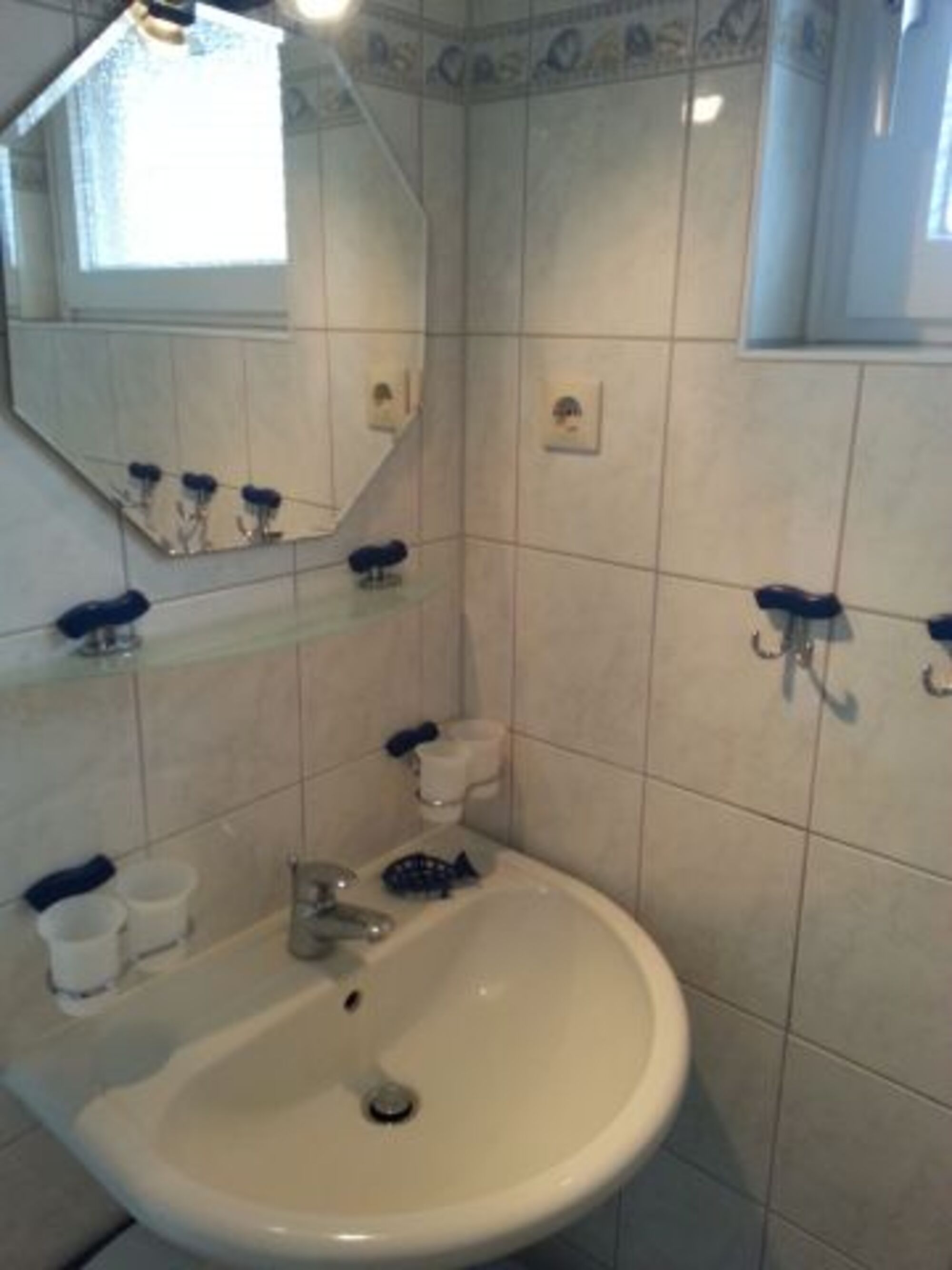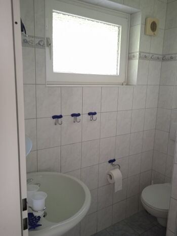 Das Bad befindet sich im Erdgeschoss. Handtücher müssen mitgebracht werden - können aber zusammen mit der Bettwäsche gemietet werden. Dieses Ferienreihenhaus hat KEINE Waschmaschine. Waschbecken, Spiegel, Fenster im Bad