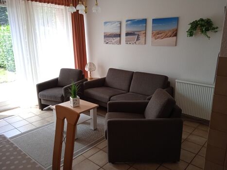 Im EG befindet sich das Wohnzimmer (ca. 20m²) mit eingezäuntem (Zaunhöhe ca. 1m) kleinen Garten mit Terrasse, 1 Sofa, 2 Sesseln, SAT-TV, Esstisch mit Stühlen,