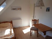 Im Kinderzimmer gibt es einen Wandklapptisch mit zwei Stühlen. Hier kann bei Bedarf ein Klappbett aufgestellt werden. Wir empfehlen es für ein Kind bis max. 10 Jahren. Einzelbett, Leselampe am Bett