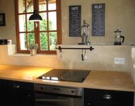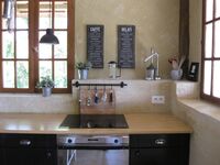 4-Platten Herd, Cerankochfeld, Kühlschrank mit Gefrierfach, Küchenmaschine, Mixer, Korkenzieher / Flaschenöffner, Gewürze (Salz, Pfeffer, Zucker), Geschirrhandtücher, Essplatz in der Küche, TV in der Küche