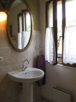 Ved poolhuset findes et toilet med vaskemaskine og en tørretumbler. Waschbecken, Spiegel, Fenster im Bad