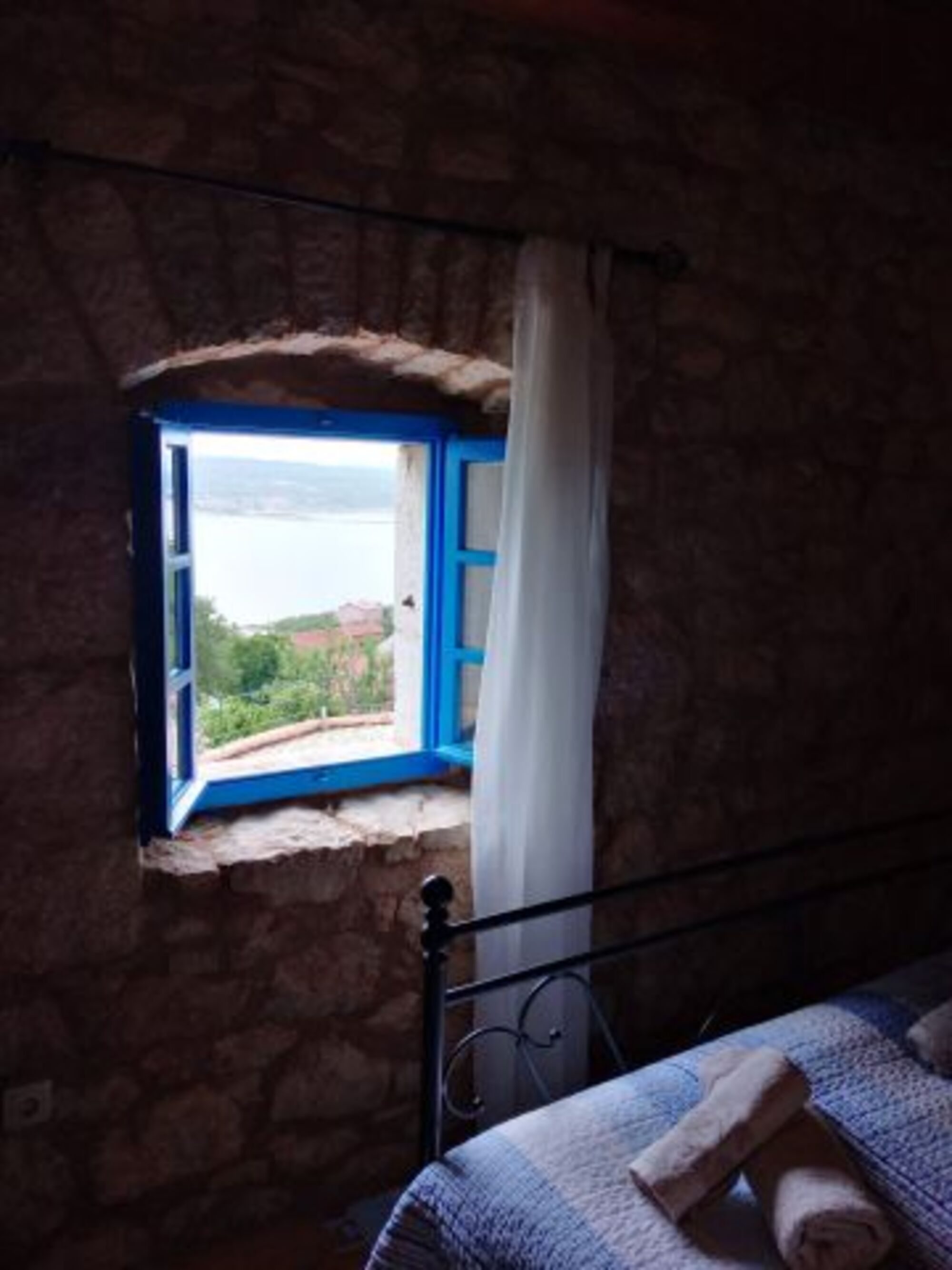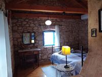 Die Treppen führen auf die zweite Etage mit dem Schlafzimmer und einem weiteren Badezimmer. Im lichtdurchfluteten Schlafzimmer sorgt neben den Steinwänden auch eine Klimaanlage für angenehme Nächte. Aus dem Doppelbett bittet sich ein traumhafter Blick auf Selce und die Adria. Aus dem Schlafzimmer gelangt man in den oberen mediterranen Garten.