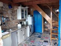 Direkt von der Terrasse aus, gelangt man in das Erdgeschoss, das durch eine Holztreppe in Wohnküche und Wohnzimmer unterteilt ist. Die Küche ist komplett mit einem Herd und Backofen, großem Kühlschrank mit Gefrierfach, Mikrowelle, Spülmaschine, Waschmaschine, Kaffeemaschine, Toaster und Wasserkocher ausgestattet. Im Wohnzimmer befindet sich ein Schlafsofa mit Satellitenfernsehen, DVD und Internetanschluss. Ebenfalls im Erdgeschoss gibt es ein Badezimmer mit Dusche und WC.