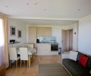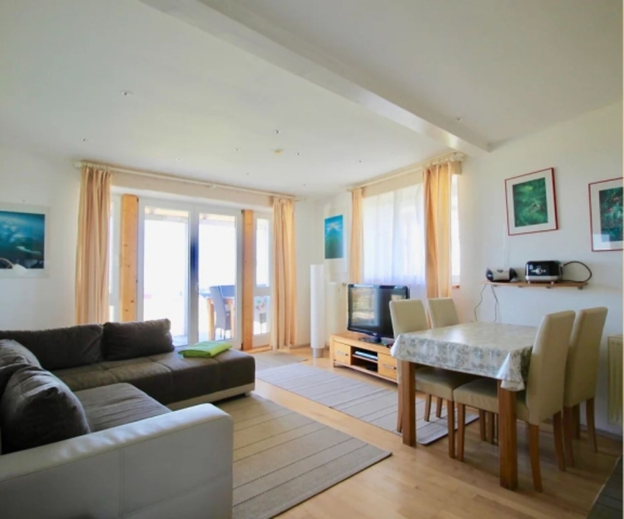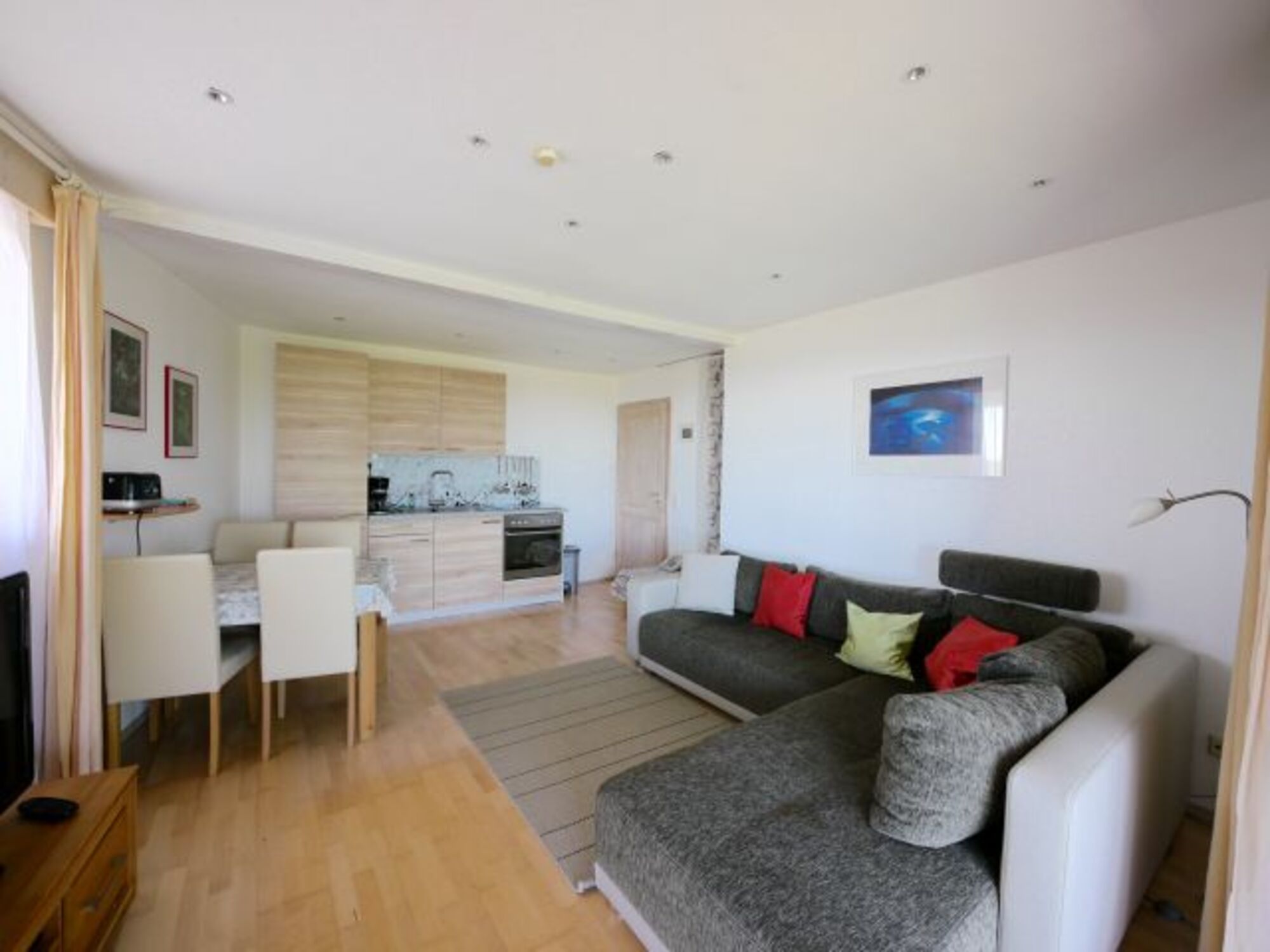 Ihre Wohnung hat Echtholzparkett, dimmbare Einbauspots, Vollholzmöbel und einen LED-Flatscreen.