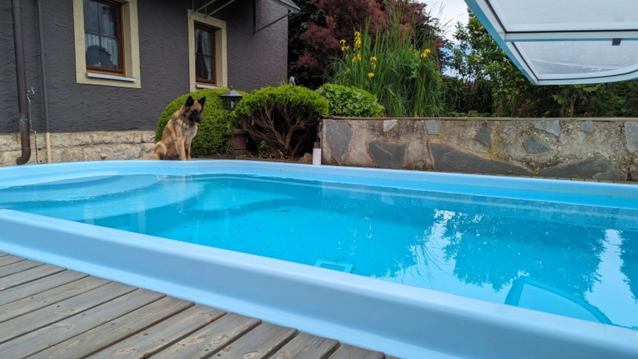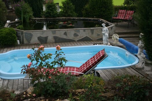 Der Garten ist terrassenförmig angelegt. Vom Haus aus gelangt man ebenerdig zum Pool: wird über Solar beheizt und ist bis zu 120 cm tief. Daher für Kleinkinder nicht geeignet! Poolnutzung ab ca Juni bis September.