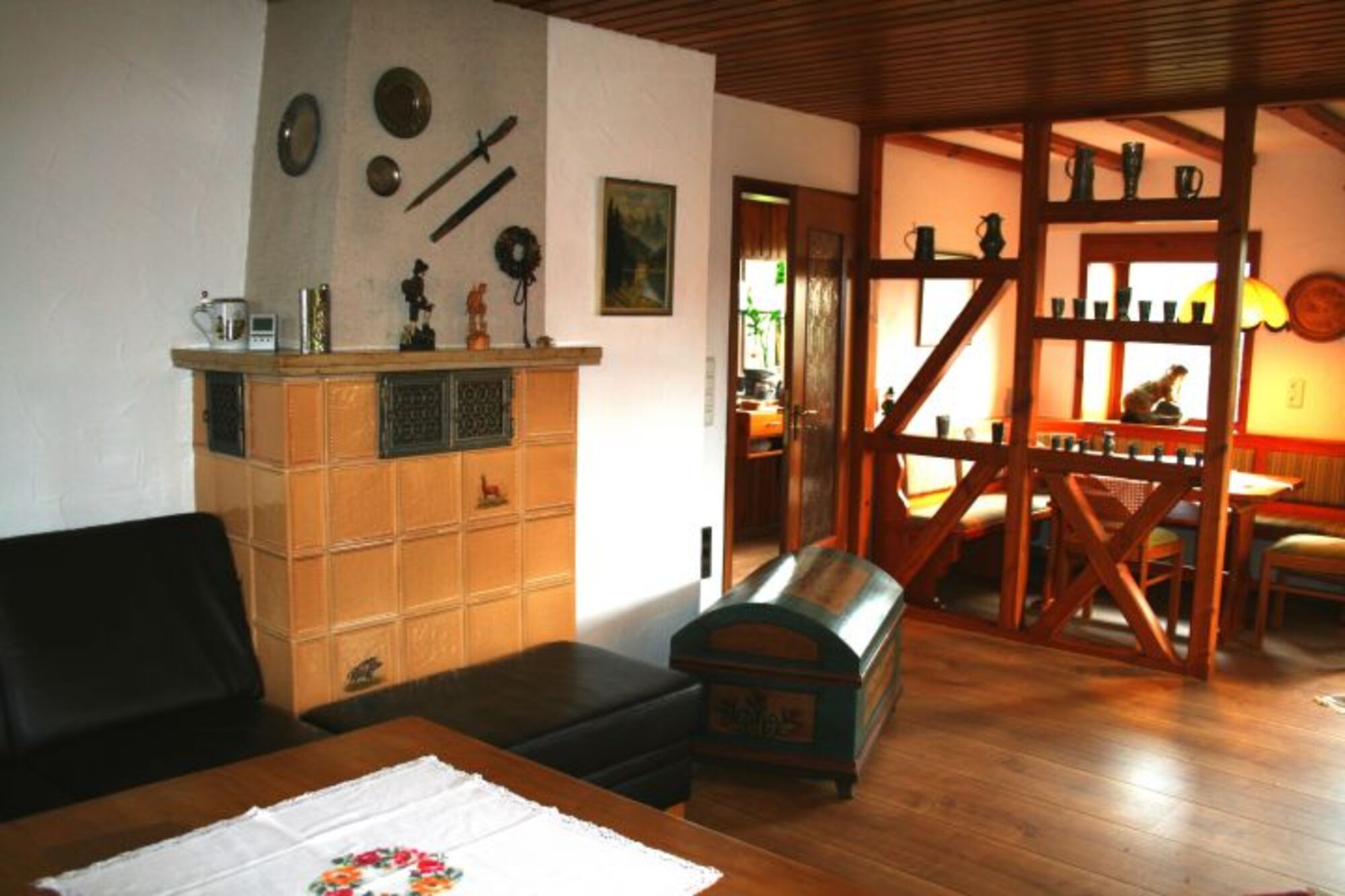Einrichtung: das Ferienhaus bietet Platz auf ca. 120qm auf 3 Ebenen. Eingangsbereich mit Garderobe. Einige Stufen führen ins Wohnzimmer. Gemütliche Sitzgruppe vor dem kuschligen Kachelofen. Dieser wird von der Küche aus mit Holz beheizt. Flachbildschirm mit SAT-Empfang. DVD-Player, PS3Player. Radio mit CD-Player. Essecke. WLAN. Sie können sich auch ein Buch aus der kleinen Bibliothek holen und es sich bei einem guten fränkischen Wein in der Leseecke gemütlich machen. Große komplett und neuwertige gut ausgestattete Küche mit Essecke, Herd mit Cerankochfeld und mit Backofen, Spülmaschine, Kühlschrank mit extra Gefrierschrank (praktisch für Barfer), Toaster, Wasserkocher, Mikrowelle, Kaffeemaschine (Vollautomat) und Filter Kaffeemaschine. Über eine geschlossene Treppe gelangt man in den 1. Stock. Im Zwischengeschoss ist noch ein Gäste WC.