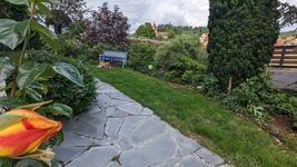 Neben dem Pool ist ein kompetent angelegter Teich mit verschiedenen Fischen u.a. Kois. Über ein paar Stufen gelangt man zum überdachten Grillplatz mit exquisiten Gartenmöbeln und gemauertem Grill. Liegewiese mit Rasen. Trampolin für die Jungen und Junggebliebenen. Durch die verschiedenen Ebenen findet sicher jeder hier ein lauschiges Plätzchen zwischen den Blumenbeeten und Rasenflächen. Durch die hoch und sehr dicht gewachsene Hecke erleben Sie hier viel Privatsphäre.