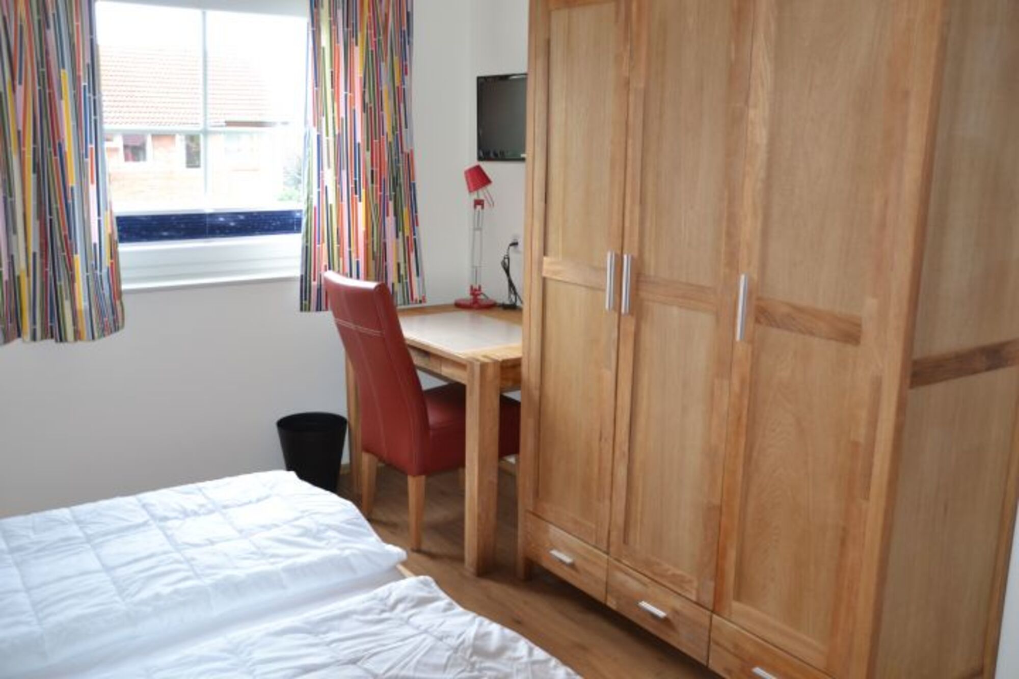 Schlafzimmer I: Doppelbett, Verdunkelungsrollos, Kleiderschrank, Fernseher, Uhren-Weckradio, Schreibtisch