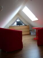 Studio: zwei Einzelbetten (zusammenschiebar), 2 Sessel, Fernseher. Es gibt keine trennende Tür zwischen Studio und Treppenaufgang/Flur.
