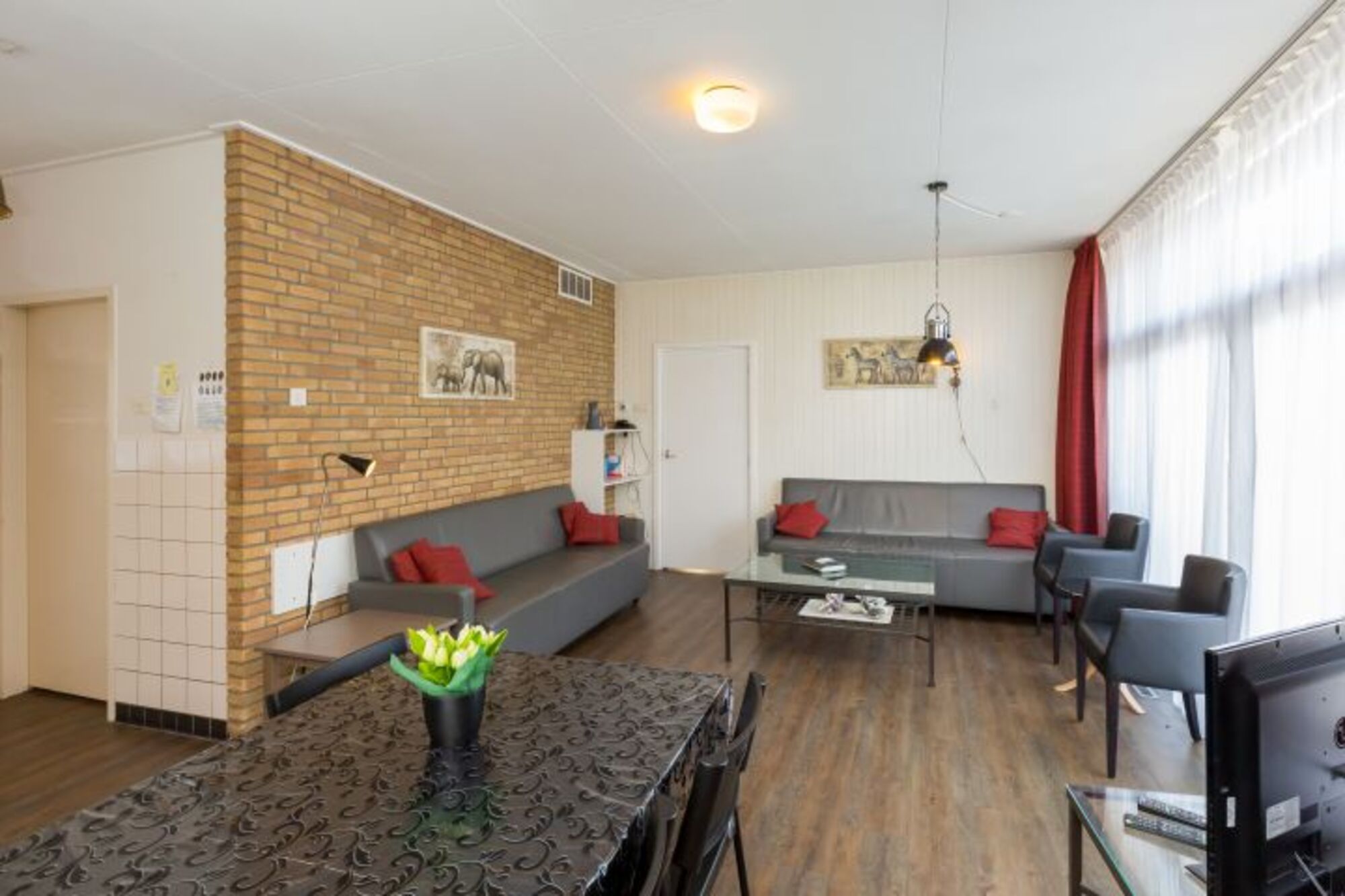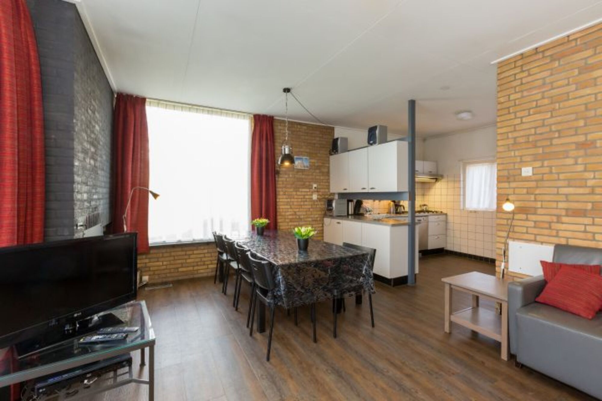 In dem Bungalow De Loeiboei ist alles ebenerdig. Das Wohnzimmer hat eine geräumige Sitzecke, einen großen, ausziehbaren Esstisch und eine gemütliche offene Küche mit einer Bar. Das Haus hat 4 Schlafzimmer,