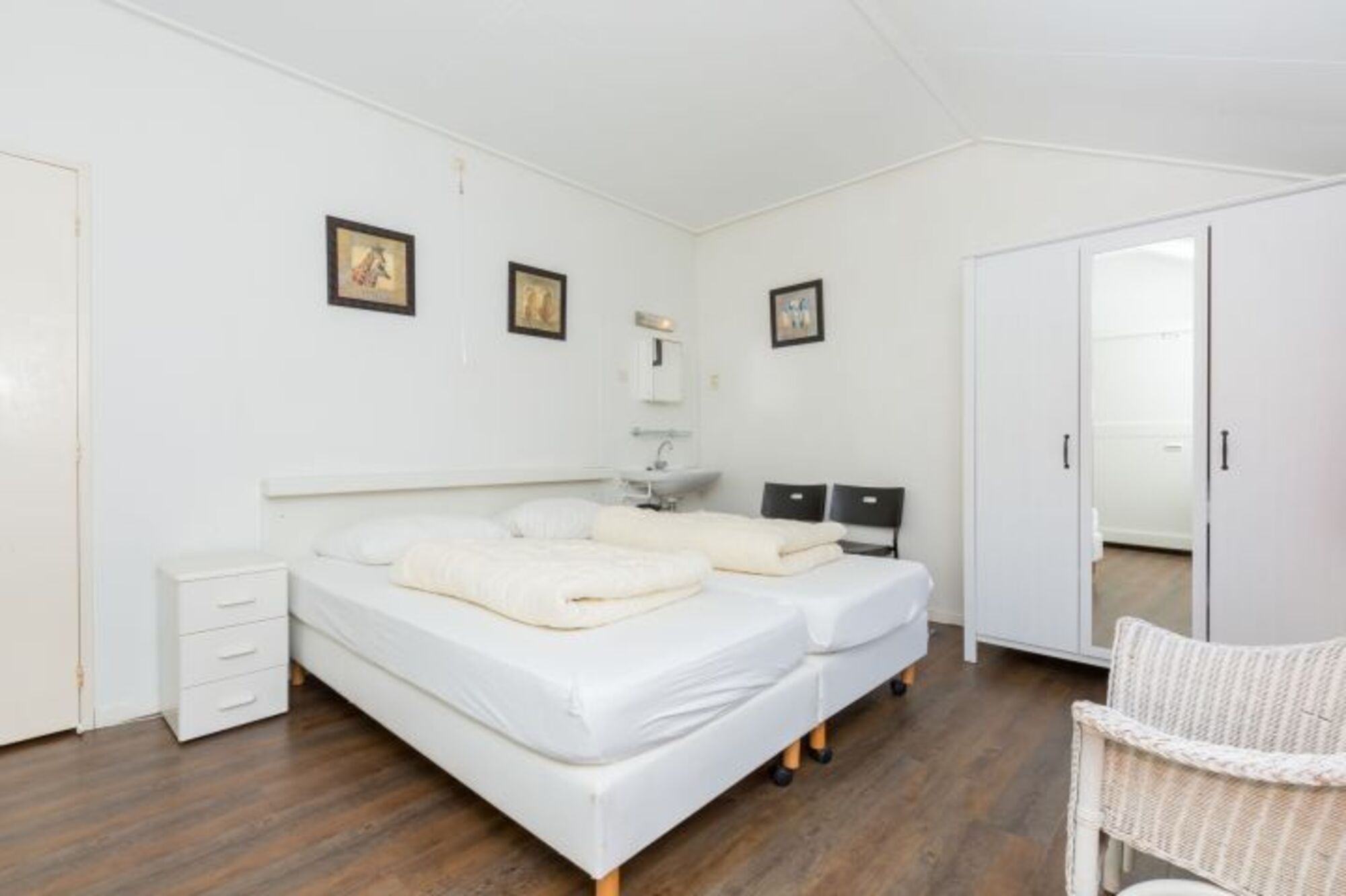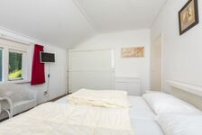 2 Einzelbetten (Boxspring), ein ausklappbares Etagenbett (es kann auch nur der untere Teil benutzt werden), ein Kinderbett und einen zweiten Fernseher Einzelbett, Boxspringbett, Spiegel, Leselampe am Bett, Schrankbett