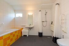 Eine der 2 Badezimmer ist für Gehbehinderte ausgestattet, Das Badezimmer hat eine erhöhte Toilette mit Haltegriffen, ein Waschbecken mit Freiraum, eine Dusche mit Duschstuhl und Wandgriff sowie einen Whirlpool mit Seiten und Bodendüsen.