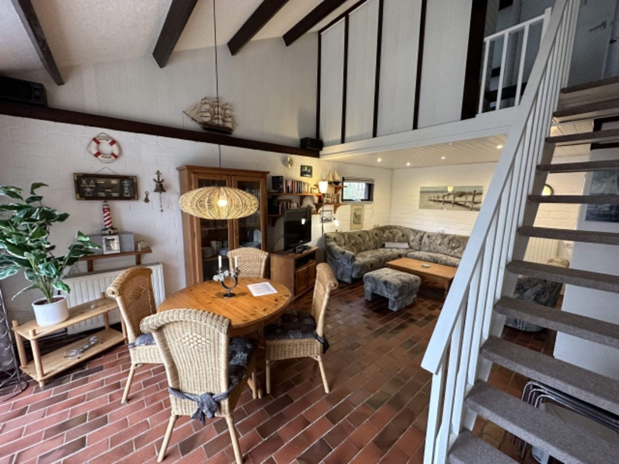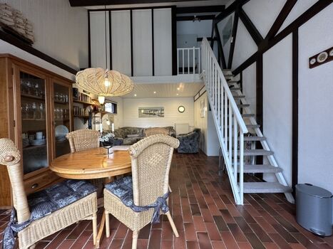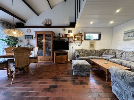 Im Erdgeschoss befinden sich die Diele mit Garderobe, ein modernes Duschbad, ein Schlafzimmer mit Doppelbett sowie das helle Wohnzimmer mit gemütlicher Sitzecke, SAT-TV und ein Essbereich für 6 Personen. Die offene Küche ist ausgestattet mit Geschirrspüler, Backofen, Mikrowelle, Kaffeemaschine und Toaster. Vom Wohnbereich gelangen Sie durch eine breite Schiebetür direkt in den eingezäunten Garten – ideal für Kinder und Hunde.
