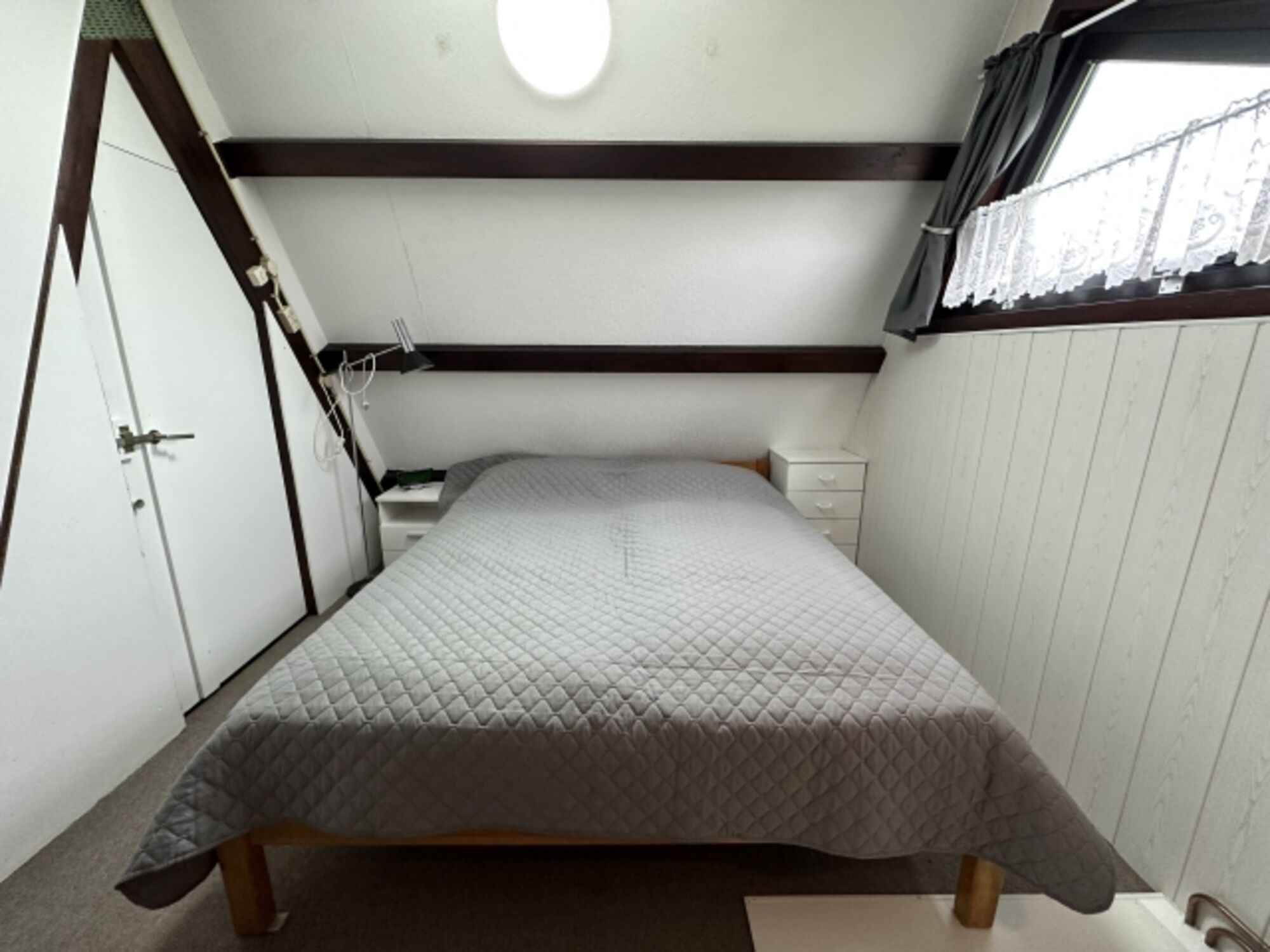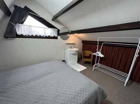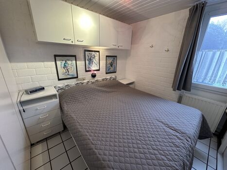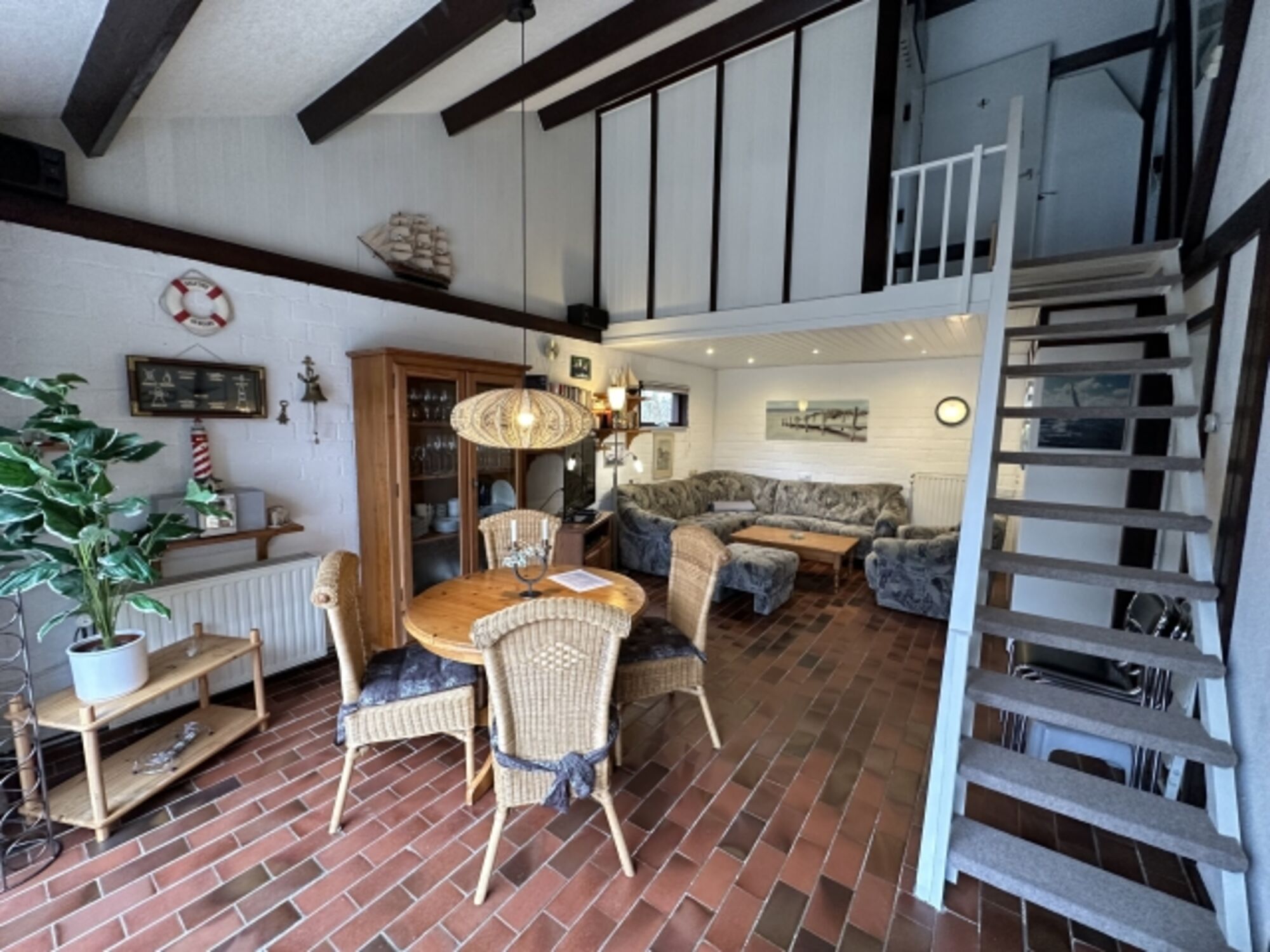 Über eine Treppe im Wohnbereich erreichen Sie die offene Galerie mit zwei Einzelbetten. Von dort aus gelangen Sie in das zweite Schlafzimmer mit weiteren zwei Einzelbetten und einem Kinderbett. Insgesamt bietet das Haus Schlafmöglichkeiten für bis zu 6 Personen