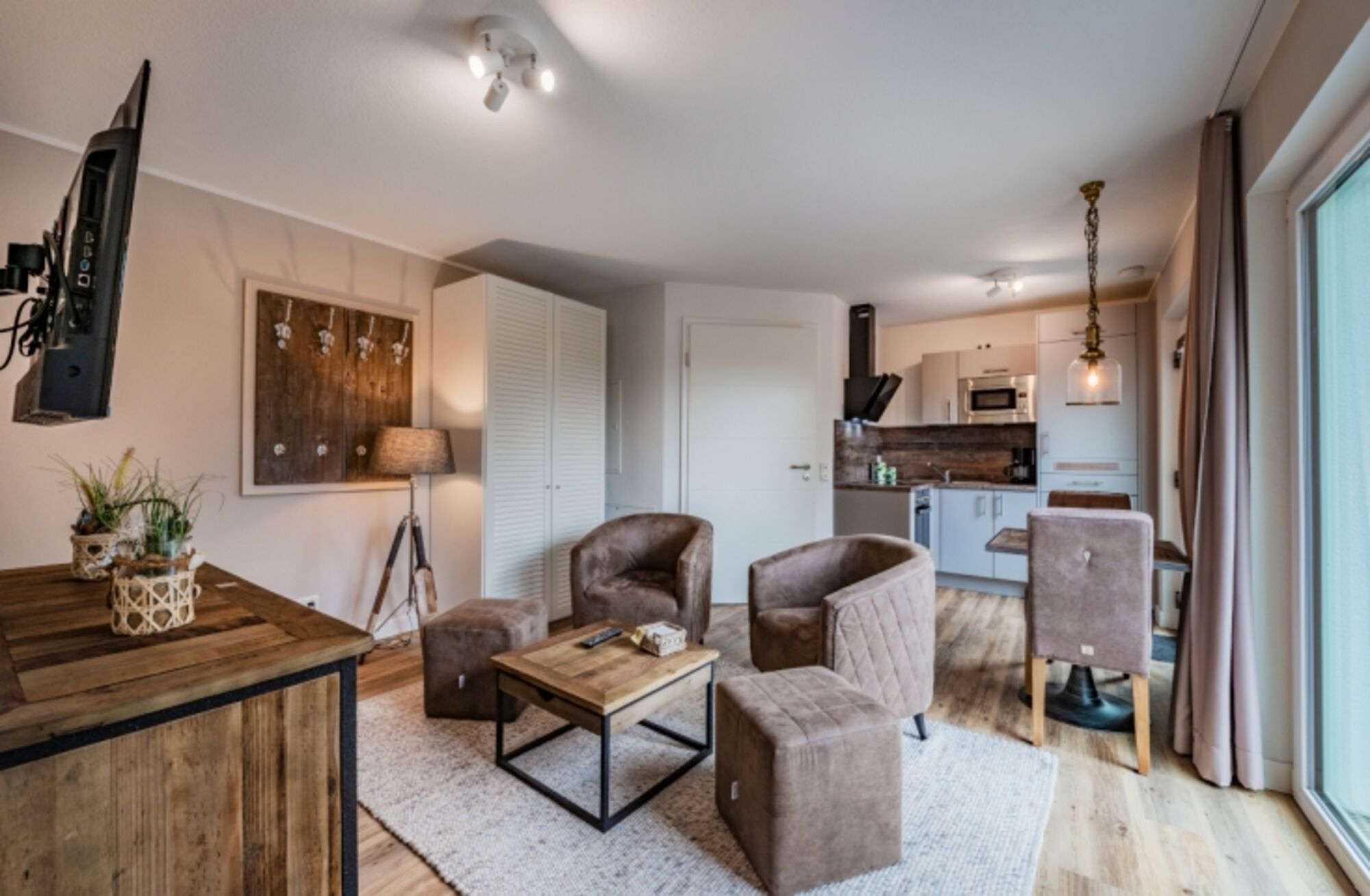 In einem Schlafzimmer, einem Badezimmer und einem Wohn-/Esszimmer mit offener Küche finden bei uns bis zu 2 Gäste Platz. Zudem verfügt die Wohnung über eine Terrasse.