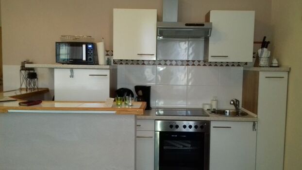 -Küchenzeile teilweise im Wohnbereich (Amerik. Art), Herd/Backofen, Kühlschrank, Kaffeemaschine, Wasserkocher, Toaster, Abzug, Mikrowelle, Bar mit Hockern