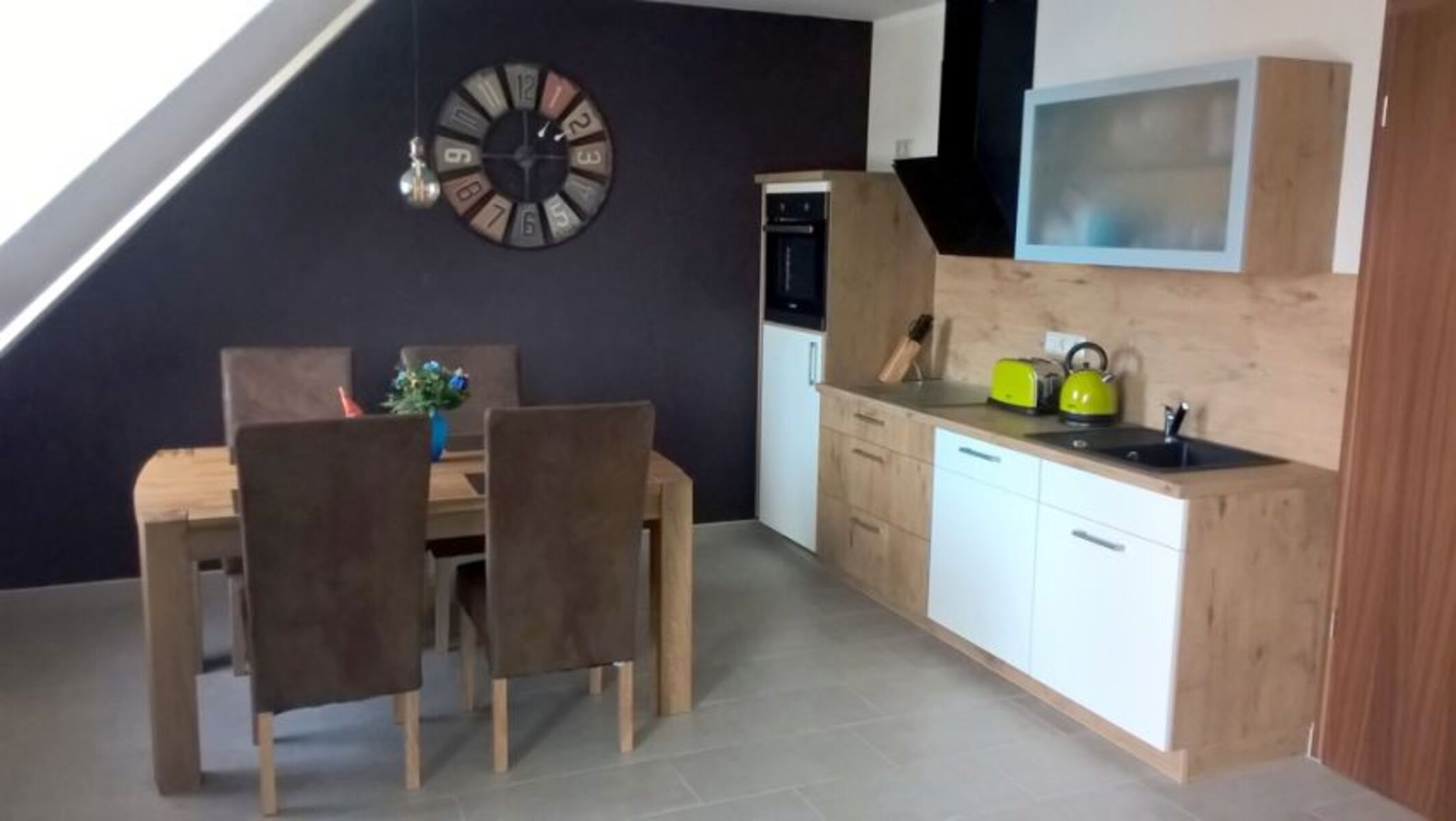 4-Platten Herd, Induktionsherd, Dunstabzugshaube, Kühlschrank mit Gefrierfach, Korkenzieher / Flaschenöffner, Gewürze (Salz, Pfeffer, Zucker), Geschirrhandtücher, Mülltüten, Essplatz in der Küche