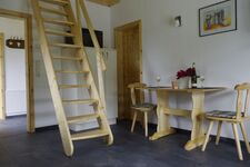 Die Ferienwohnung ist durch eine Galerie ergänzt. Die Galerie unter der Dachschrägung ist über eine Raumspartreppe zu erreichen. Wer die Galerie nutzen möchte, sollte sich in der Lage sehen hinaufzugelangen. Die Galerie wird durch eine Reling gesichert, zum Wohnraum hin offen. Auf der Galerie ist eine gemütliche Leseecke mit spannenden Büchern und 1 Bett und Kleiderschrank eingerichtet.