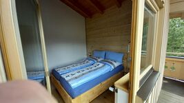 Ausgang zum Balkon, Zirbenbett !!! Doppelbett 1,60 x 2,00m, Leselampe am Bett