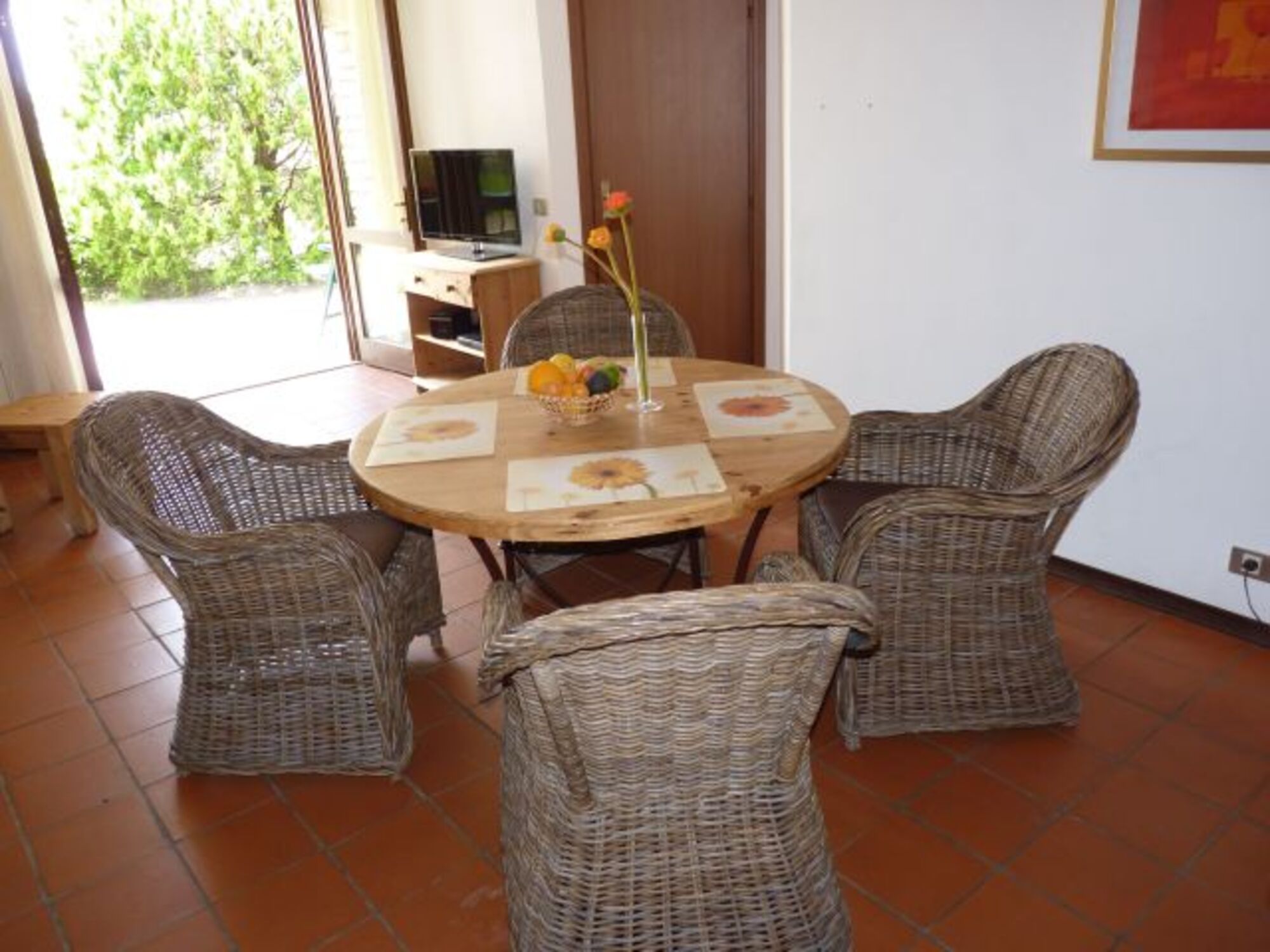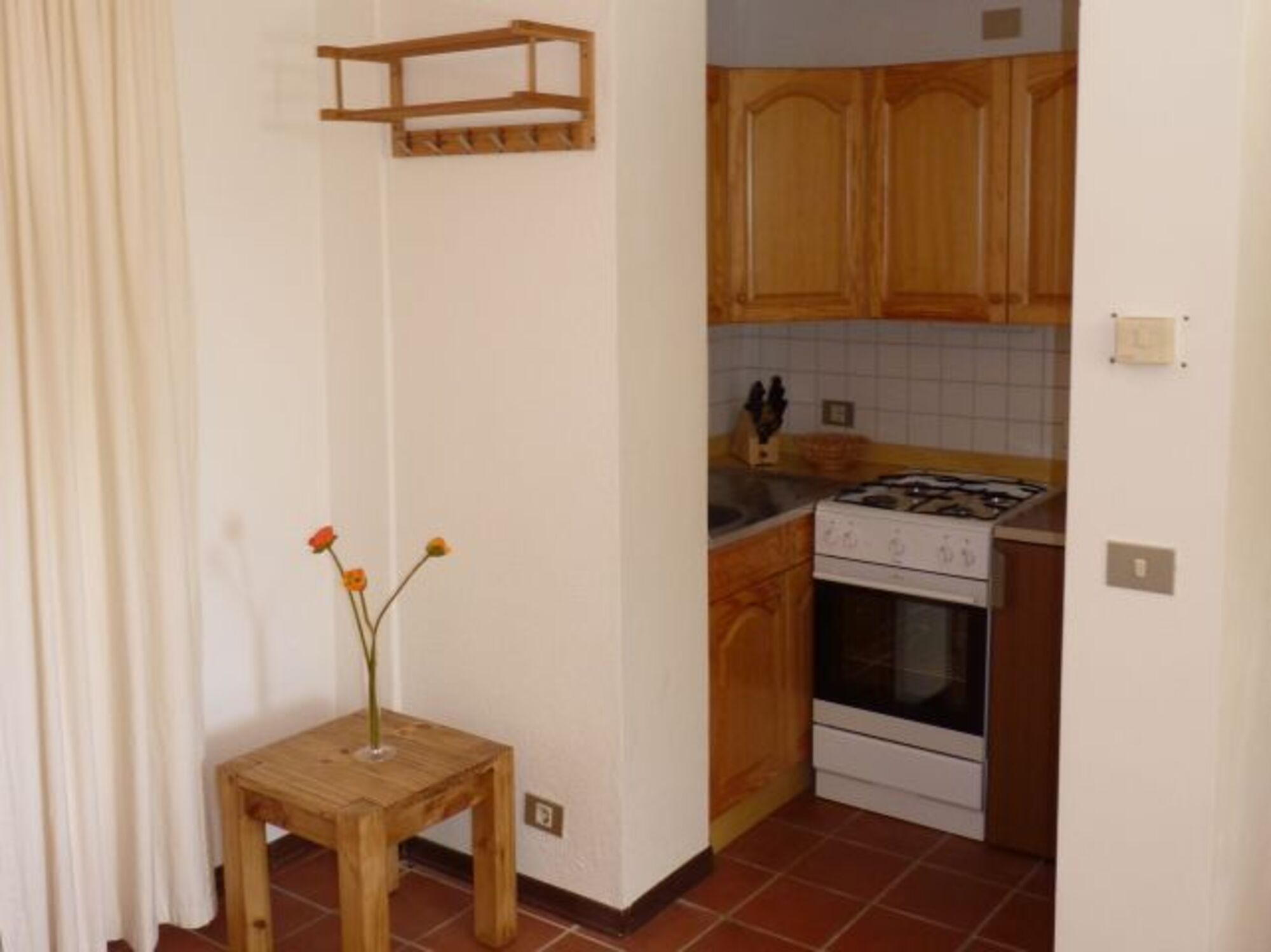 Die Wohnung ist rückseitig gegen den Hang gebaut. Wohnraum und Schlafzimmer sind von der Südseite mit zwei großen Glastüren zur Veranda belichtet.
