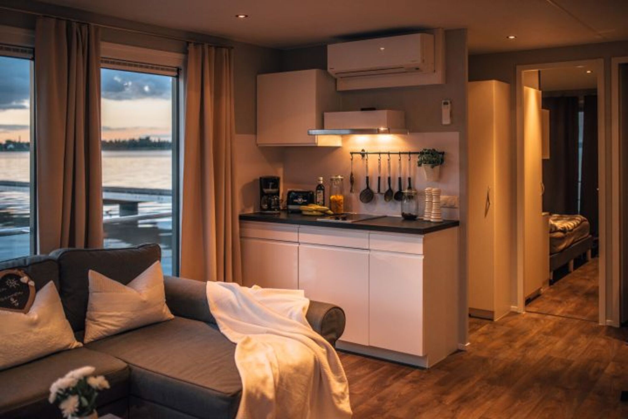 Das Hausboot verfügt über eine komfortable Innenausstattung mit einer Küche und separaten Schlafzimmern.
