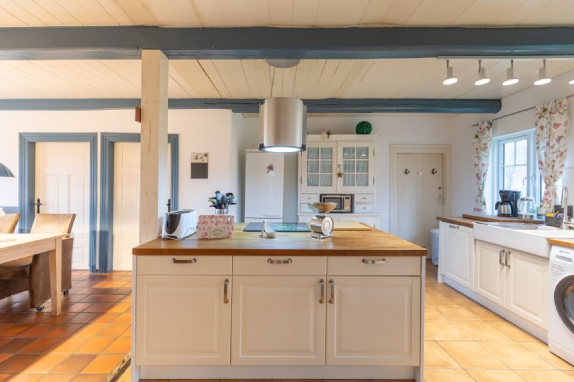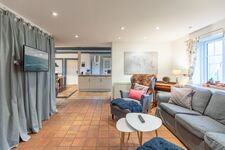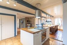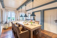 Der große Esstisch lädt zu gemütlichen Abenden im Kreise der Freunde oder Familie ein. Die offene Küche ist mit einem Geschirrspüler, Herd, Backofen, Filterkaffeemaschine, Toaster, Wasserkocher, einer Mikrowelle und einem Kühlschrank mit Gefrierfach ausgestattet.