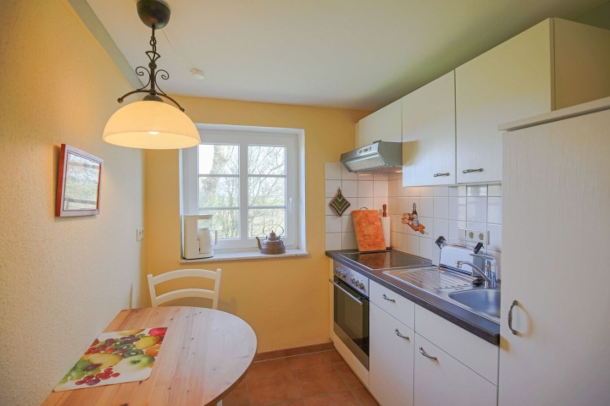 Im Wohnzimmer stehen Ihnen ein großer LCD-Fernseher (SAT), ein DVD-Player und eine Stereoanlage mit jeweils einer kleinen Auswahl an Filmen und CDs zur Verfügung. An kühleren Abenden können Sie am prasselnden Kachelofen schöne Lesestunden verbringen. Kaminholz in ausreichender Menge ist im Mietpreis enthalten. Der große Esstisch bietet Platz für acht Personen und lädt zum gemütlichen Verweilen mit Familie und Freunden ein. Die komfortabel eingerichtete Küche mit Terrassenzugang ist mit Ceranfeld, Backofen, Gefrierschrank, Kühlschrank, Mikrowelle, Kaffeemaschine (Filtergröße 4), Toaster, Wasserkocher, Geschirrspüler und reichhaltigem Küchenequipment ausgestattet.