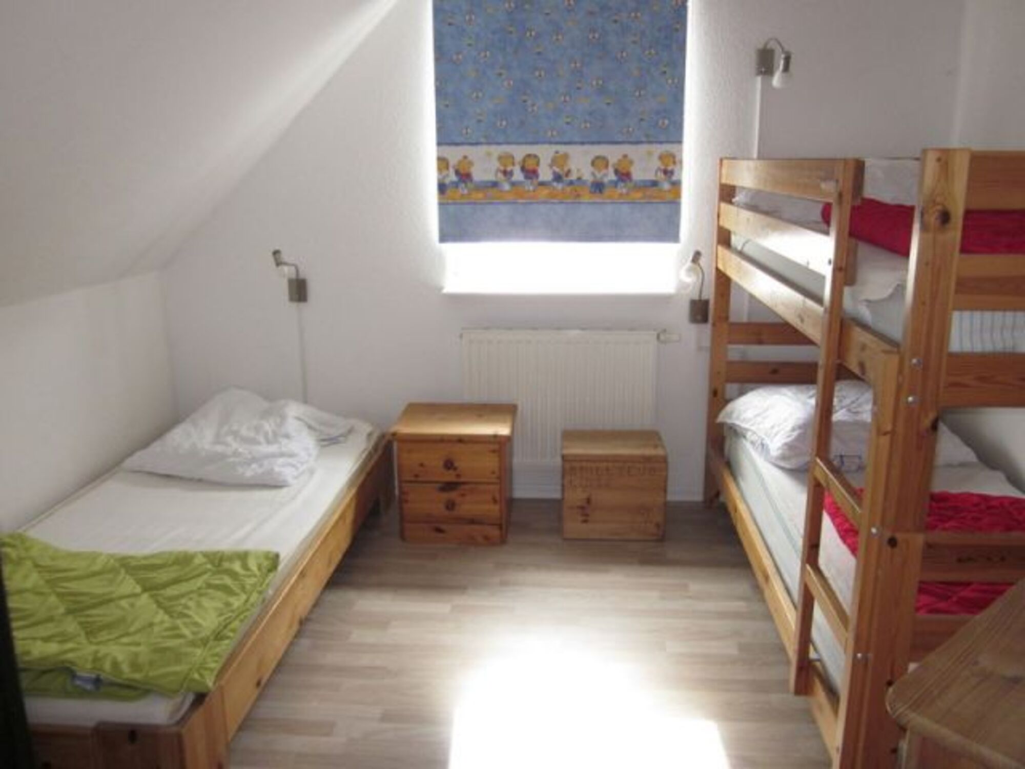 Im Obergeschoß sind ein Kinderzimmer mit einem Etagenbett, einem Einzelbett und einem Kinderreisebett sowie einem Wickeltisch.