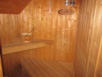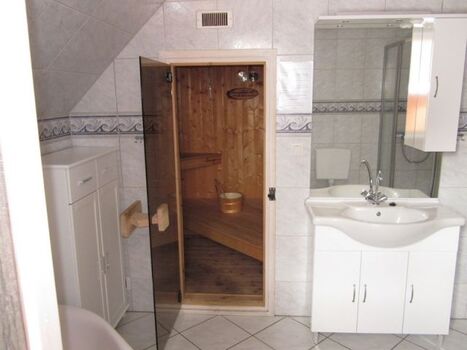 Das Badezimmer ist ausgestattet mit einer Sauna ( max. 3 Personen ), einer Eckbadewanne , Dusche und WC. Neben dem Bad befindet sich ein separater Abstellraum mit Waschmaschine.