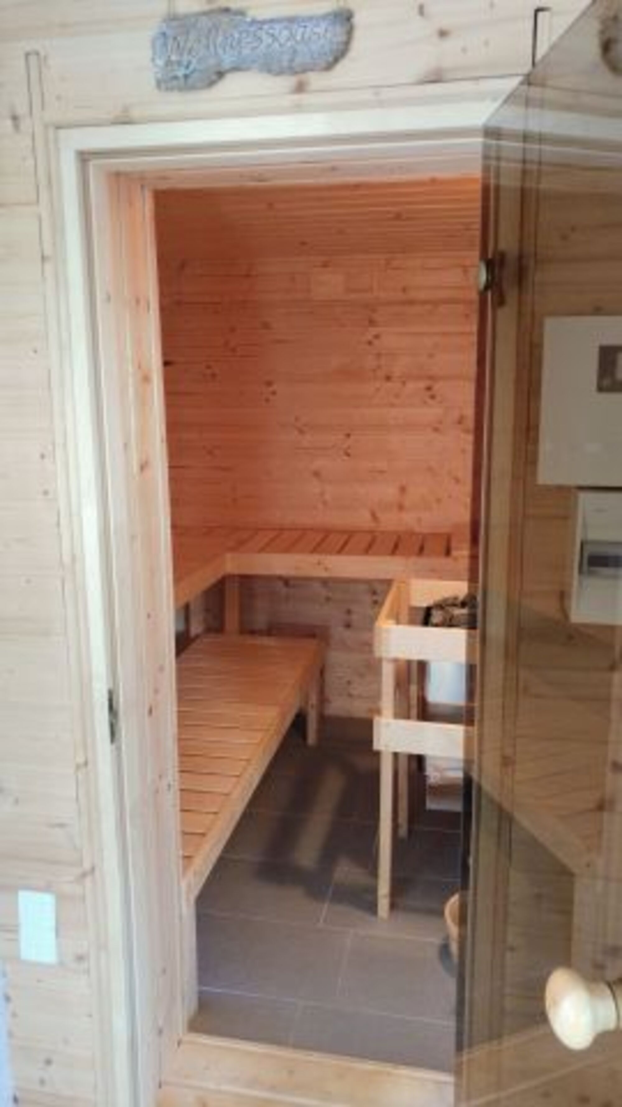 Im Erdgeschoß des Hauses finden Sie ein Schlafzimmer, sowie die, an den gemütlichen Sitzbereich angrenzende Sauna und eines der beiden Duschbäder.