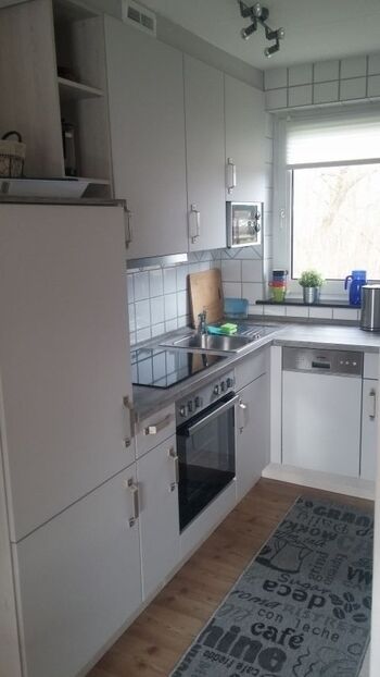 Cerankochfeld, Dunstabzugshaube, Kühlschrank mit Gefrierfach, Mixer, Waffeleisen, Korkenzieher / Flaschenöffner, Gewürze (Salz, Pfeffer, Zucker), Öl / Essig, Geschirrhandtücher, Mülltüten