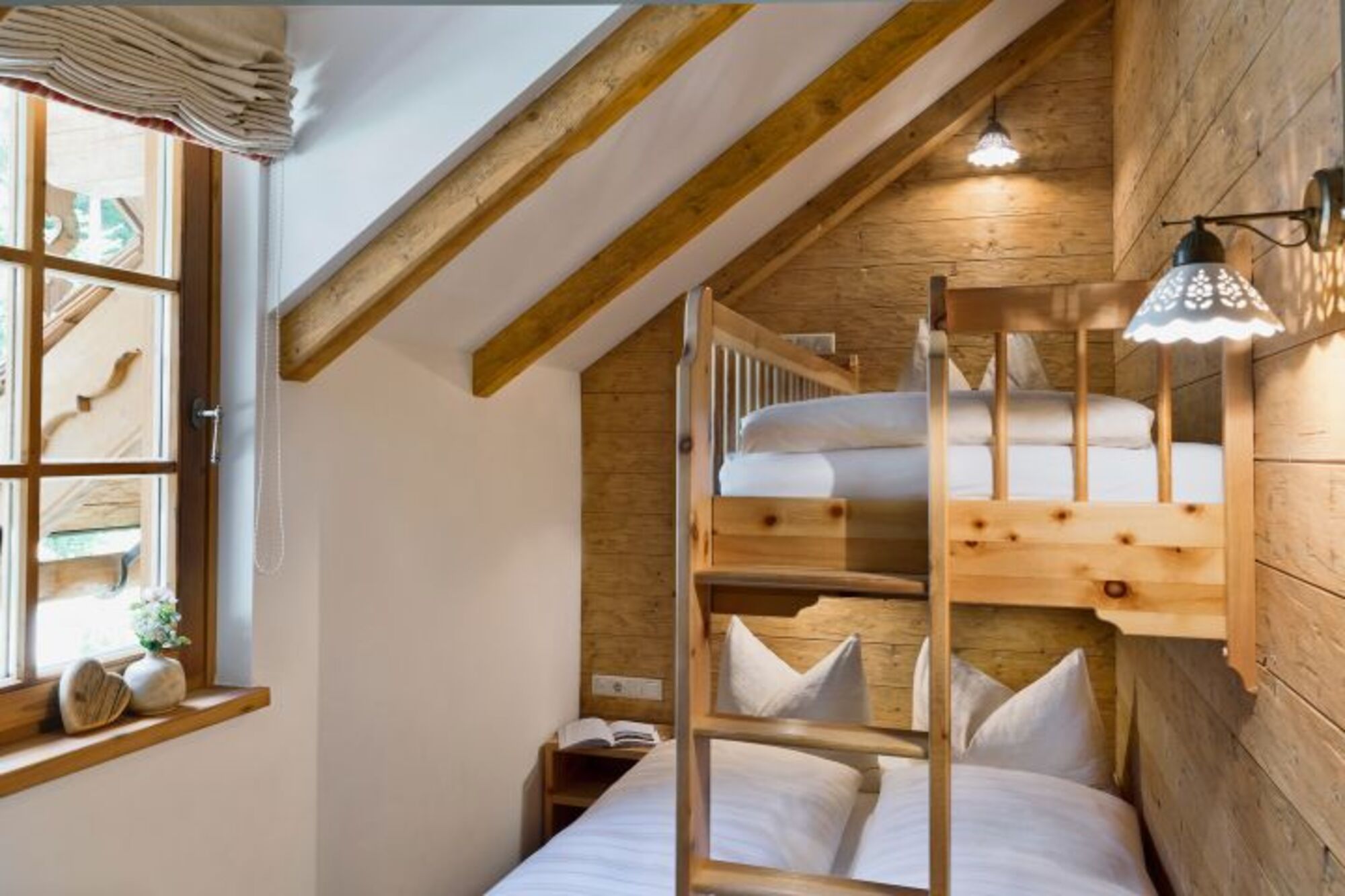 Die Almrosen-Hütte hat eine Wohnfläche von 140 m² auf zwei Ebenen und bietet Platz für 4 bis 10 Personen. Sie verfügt über 2 Schlafzimmer für je 2 Pers. (jeweils Doppelbett), 2 Schlafzimmer für je 3 Pers. (jeweils Doppel- und Etagenbett), 2 Bäder, eine voll ausgestattete Vollholzküche, einen gemütlichen Kaminofen, einen privaten Wellnessbereich mit Sauna und Dampfbad, eine Außenbadewanne im Garten, einen Ruheraum und einen Zaun rund um das Chalet.