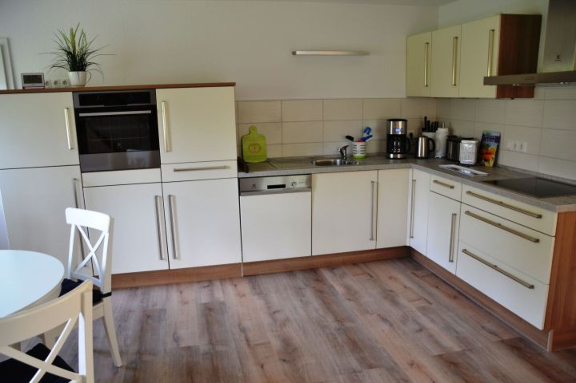 Cerankochfeld, Dunstabzugshaube, Kühlschrank mit Gefrierfach, Korkenzieher / Flaschenöffner, Essplatz in der Küche