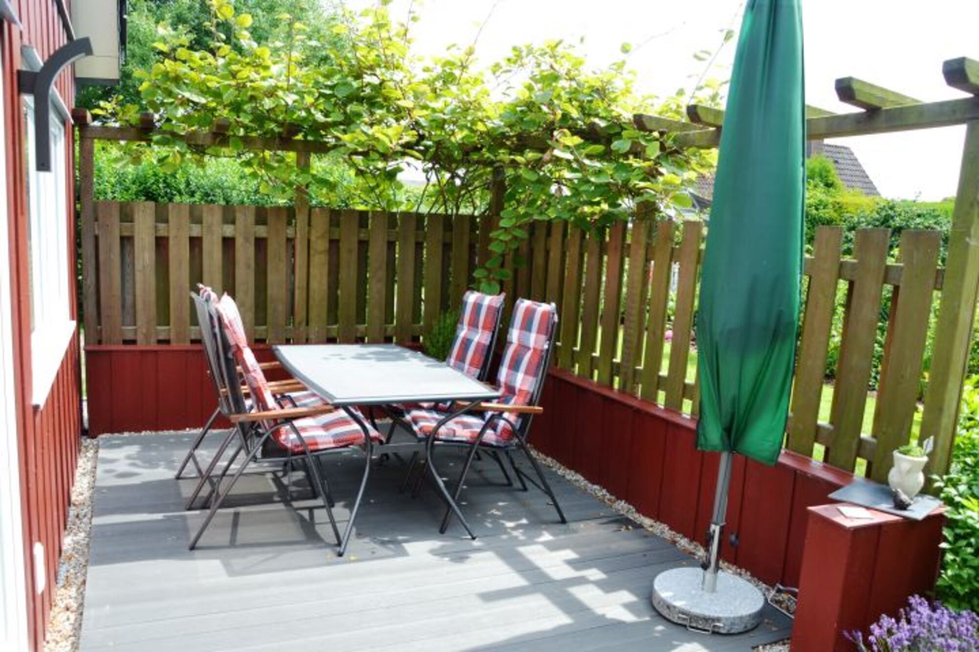 Außenausstattung: Terrasse, Gartenmöbel, 2 Liegen, Schirm, Grill, Carport, eingezäuntes Grundstück