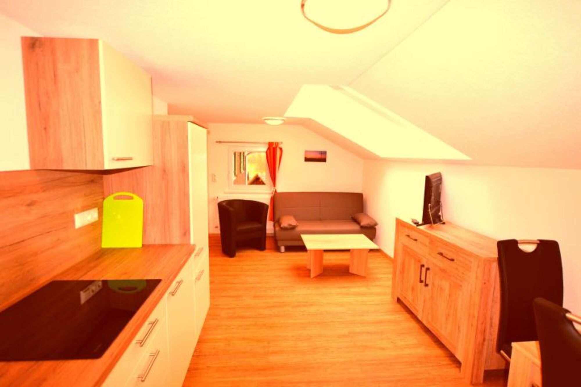 Cerankochfeld, Dunstabzugshaube, Gefrierschrank, Eierkocher, Korkenzieher / Flaschenöffner, Gewürze (Salz, Pfeffer, Zucker), Geschirrhandtücher, Mülltüten, Essplatz in der Küche, TV in der Küche