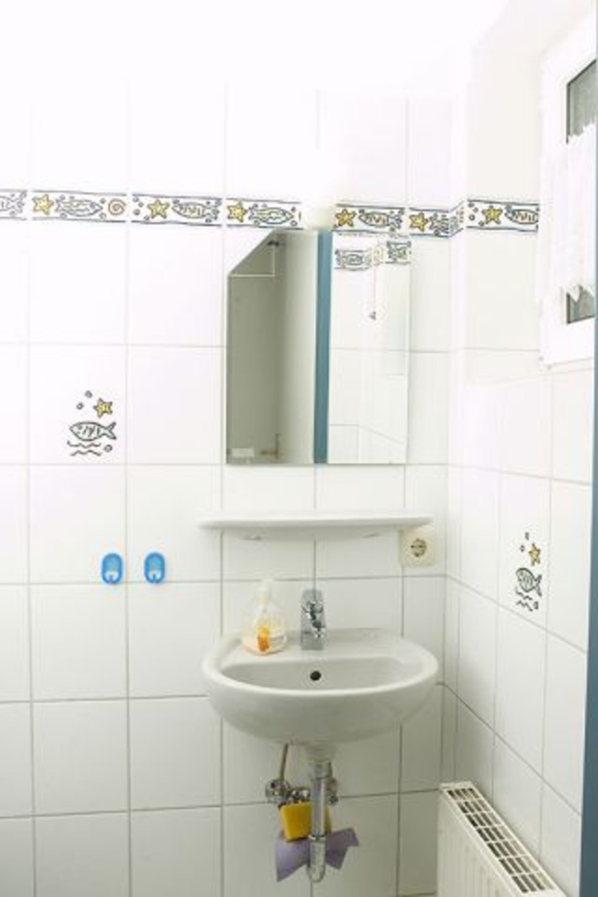 Waschbecken, Spiegel, Fenster im Bad