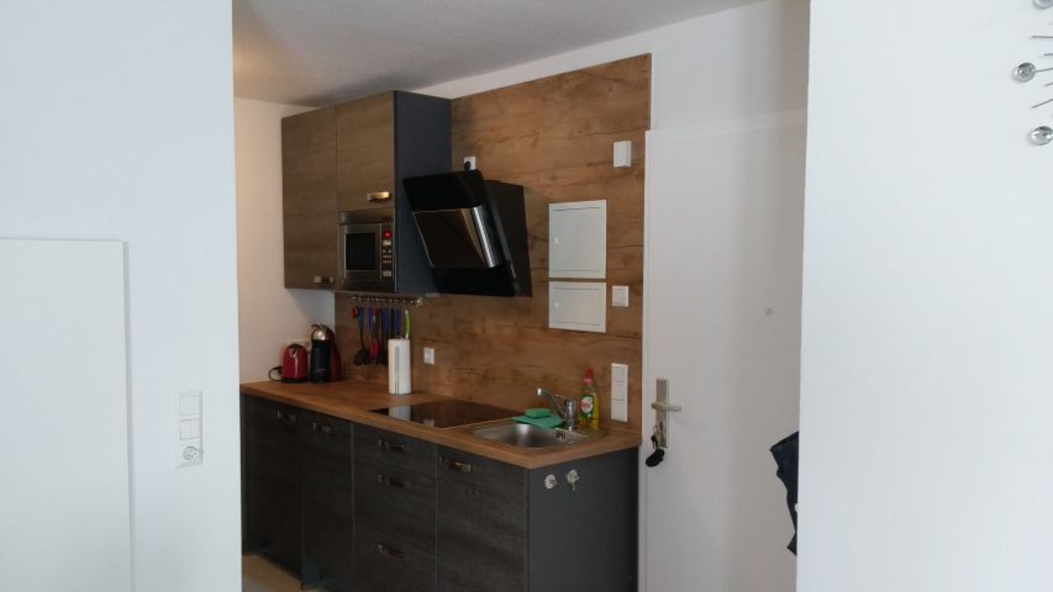 Cerankochfeld, Dunstabzugshaube, Kühlschrank mit Gefrierfach, Tassimo-Kaffeautomat, Korkenzieher / Flaschenöffner, Geschirrhandtücher, Mülltüten