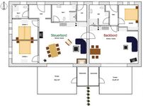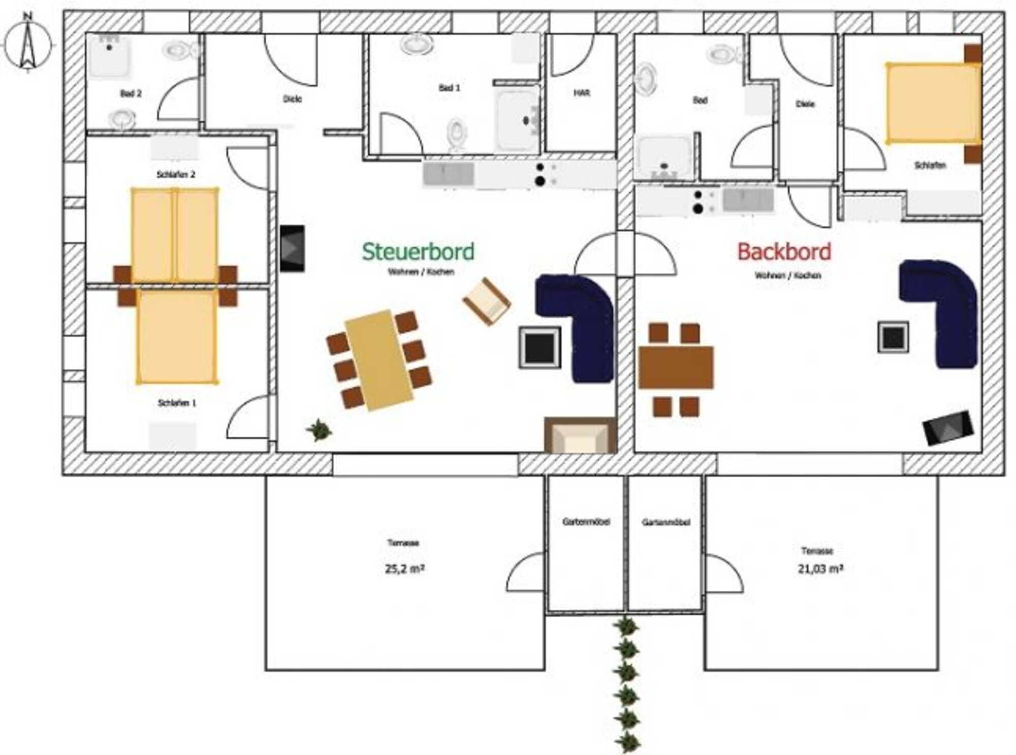 Dieses moderne EG. Haus kann auch gemeinsam mit Backbord gebucht werden. Zusammen ergibt sich dann das Ferienhaus Dat Schipp für bis zu 10 Personen. Nur das Haus Steuerbord ist für bis zu 6 Personen mit 2 Schlafzimmern + Schlafsofa im Wohnzimmer ausgelegt.