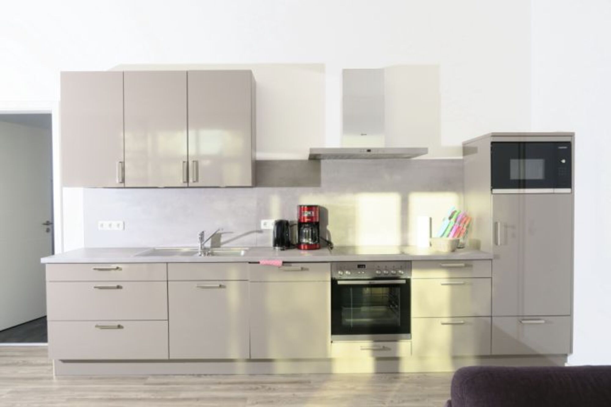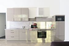 Cerankochfeld, Kühlschrank mit Gefrierfach, Korkenzieher / Flaschenöffner, Gewürze (Salz, Pfeffer, Zucker), Geschirrhandtücher, Mülltüten