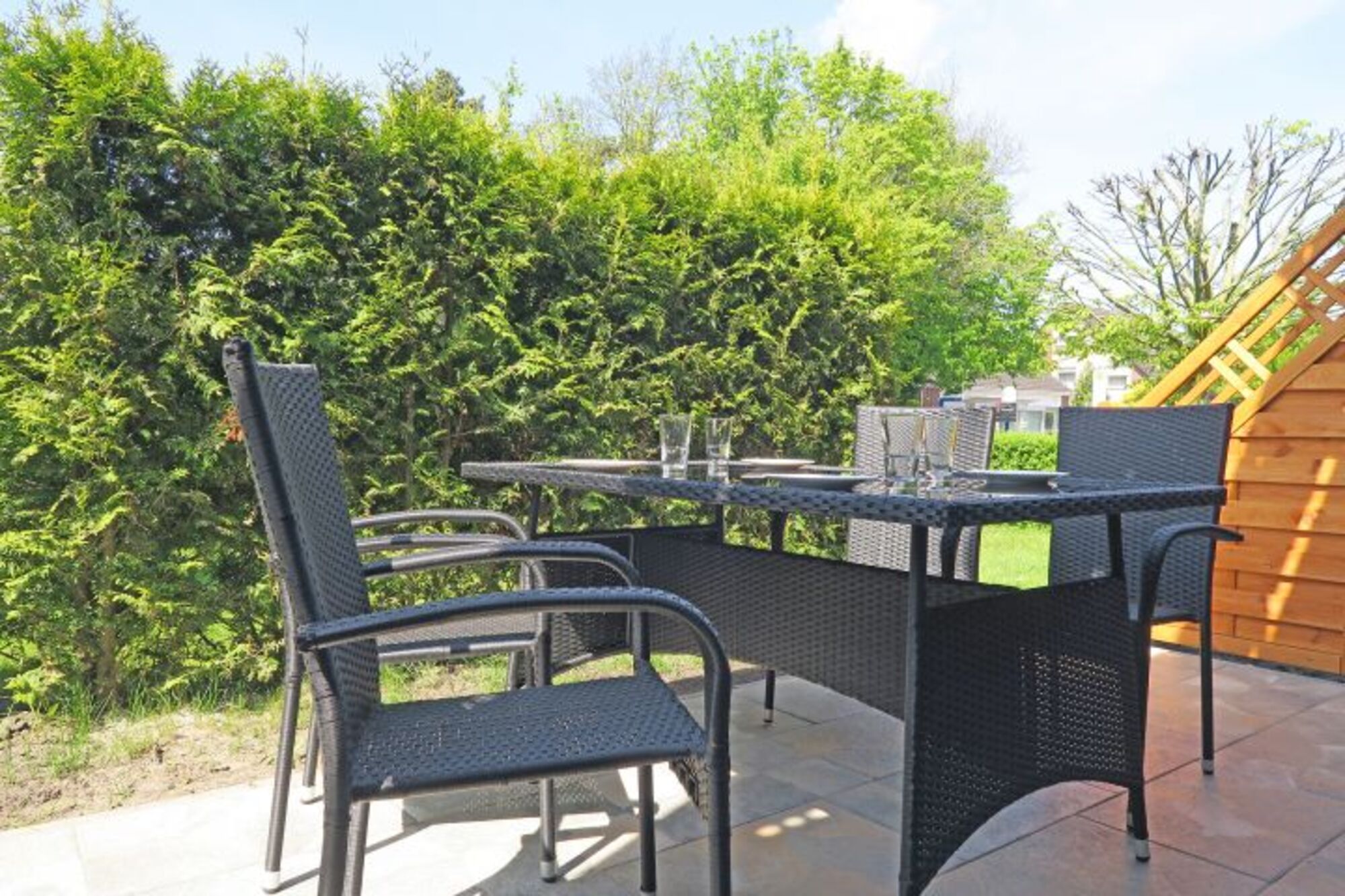 Ein kleiner sonniger Garten mit einer Terrasse steht Ihnen für den perfekten Urlaub zur Verfügung.