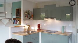 4-Platten Herd, Induktionsherd, Dunstabzugshaube, Kühlschrank mit Gefrierfach, Senseo-Kaffeeautomat, Mixer, Waffeleisen, Korkenzieher / Flaschenöffner, Gewürze (Salz, Pfeffer, Zucker), Öl / Essig, Mülltüten, Essplatz in der Küche