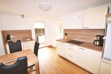 Cerankochfeld, Gefrierschrank, Eierkocher, Korkenzieher / Flaschenöffner, Gewürze (Salz, Pfeffer, Zucker), Geschirrhandtücher, Mülltüten, Essplatz in der Küche