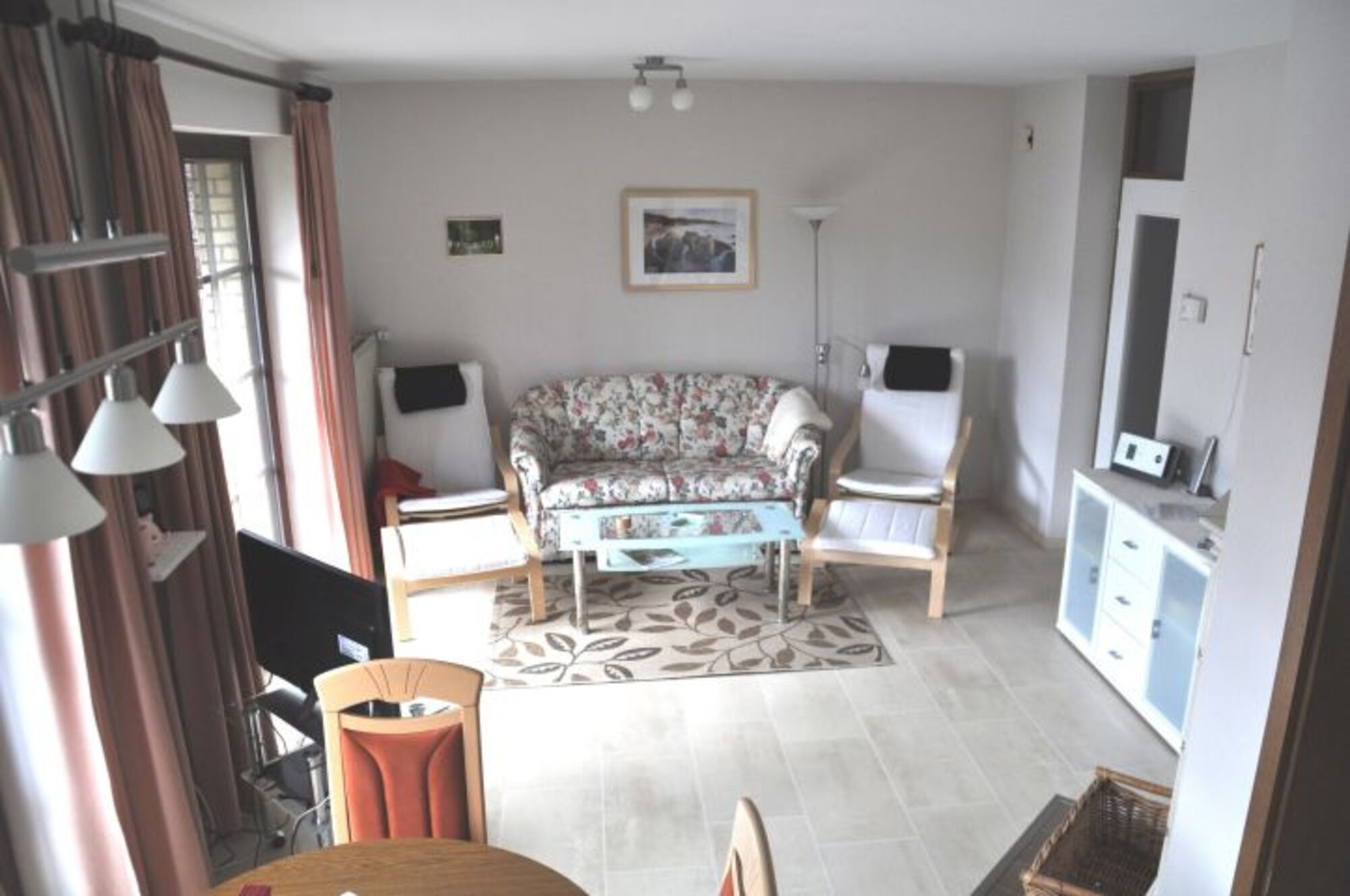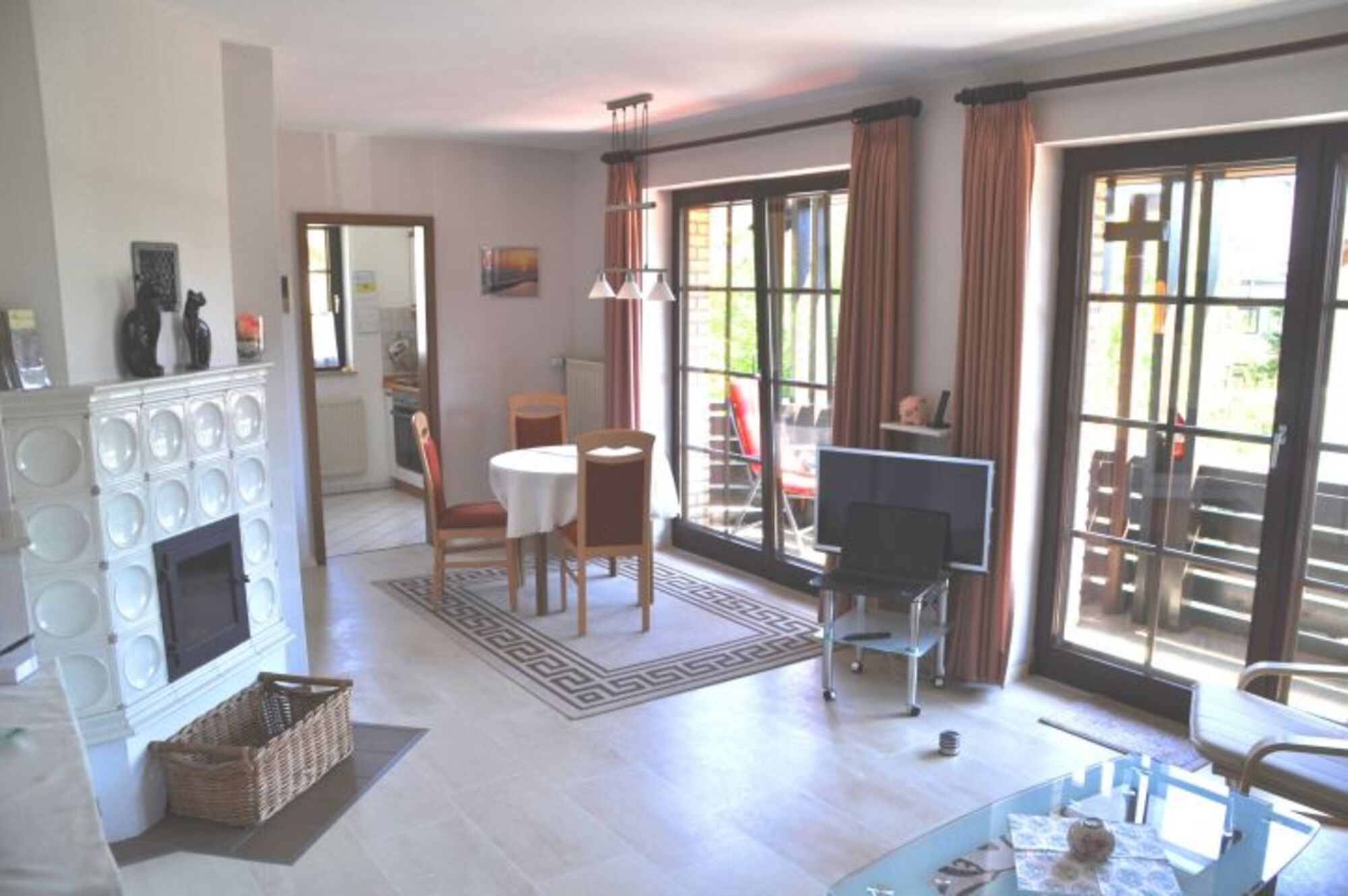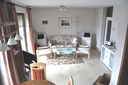 Von dort gelangen Sie direkt ins Wohnzimmer mit einer Zweier-Schlafcouch (190 x 140 cm), einem Fernsehstuhl mit Fußhocker und vielen weiteren Möbelstücken, die Ihnen einen Aufenthalt angenehm und bequem gestalten. So auch der 42" Flatscreen Fernseher. Besonders sticht hier der weiße Kamin hervor, den Sie bereits auf dem Hauptfoto bewundern können. Außerdem gelangen Sie aus dem Wohnzimmer direkt auf den großzügigen, überdachten Balkon in Ostrichtung mit bequemen Gartenmöbeln.