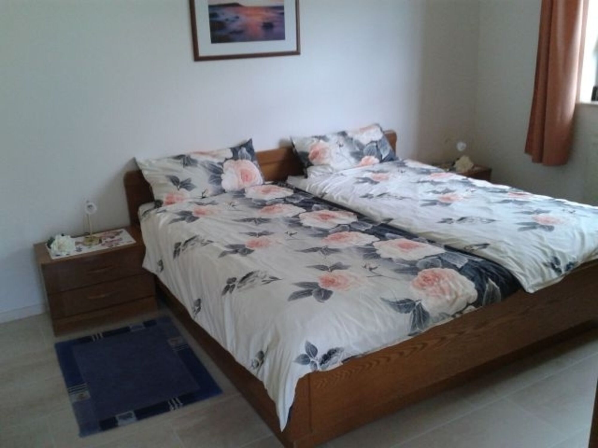 Vom Flur geht es auch ins Schlafzimmer mit einem Doppelbett und separaten Matratzen von jeweils 200 x 100 cm, sowie einem großen Kleiderschrank.