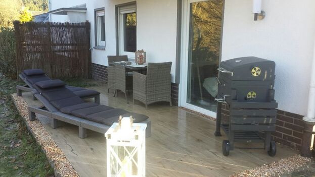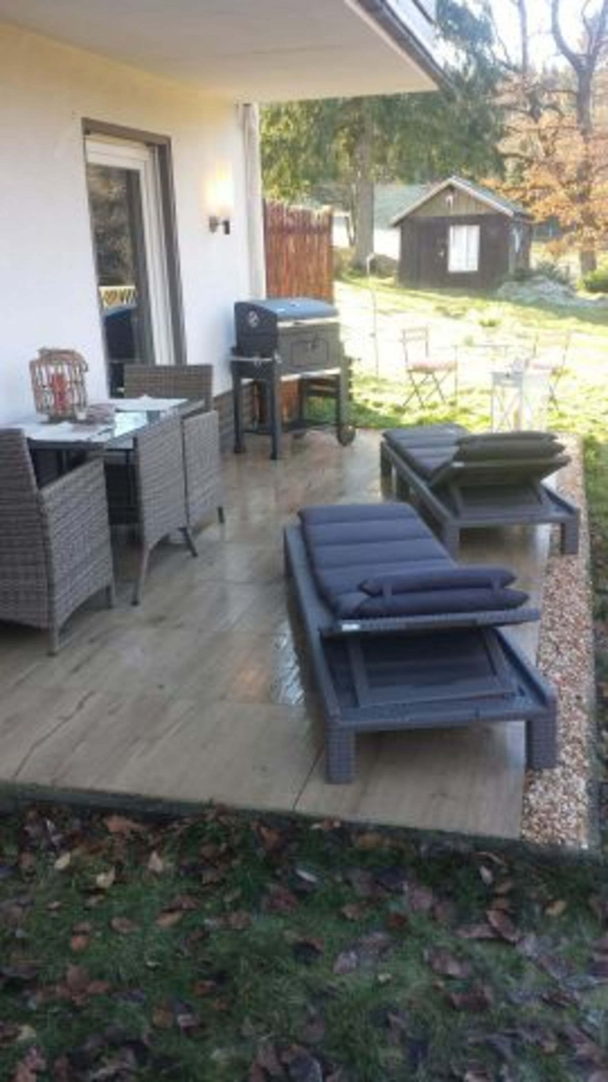 Terrasse mit Garten am Waldrand. Hunde wohnen hier kostenlos.