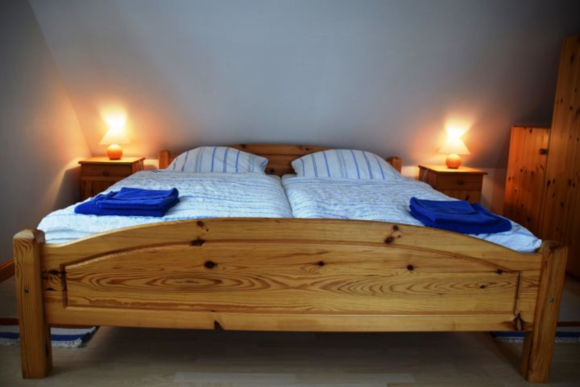 Das für maximal 6 Personen geeignete und etwa 90qm große Domizil verfügt über ein gemütliches Wohn- und Esszimmer mit elegant integrierter Küche sowie über insgesamt 3 großzügige Schlafzimmer. Zwei Schlafzimmer, eines mit Doppelbett und eines mit zwei Einzelbetten befinden sich im Obergeschoss, sowie ein geräumiges Duschbad mit Waschmaschine. Das dritte Schlafzimmer mit Doppelbett und eigenem Ausgang auf die Terrasse befindet sich im Erdgeschoss, ebenso das 2.Duschbad. Ein schwedischer Kachelofen bietet unseren Gästen auch bei kalten Urlaubstagen eine wohlige, gemütliche Atmosphäre.