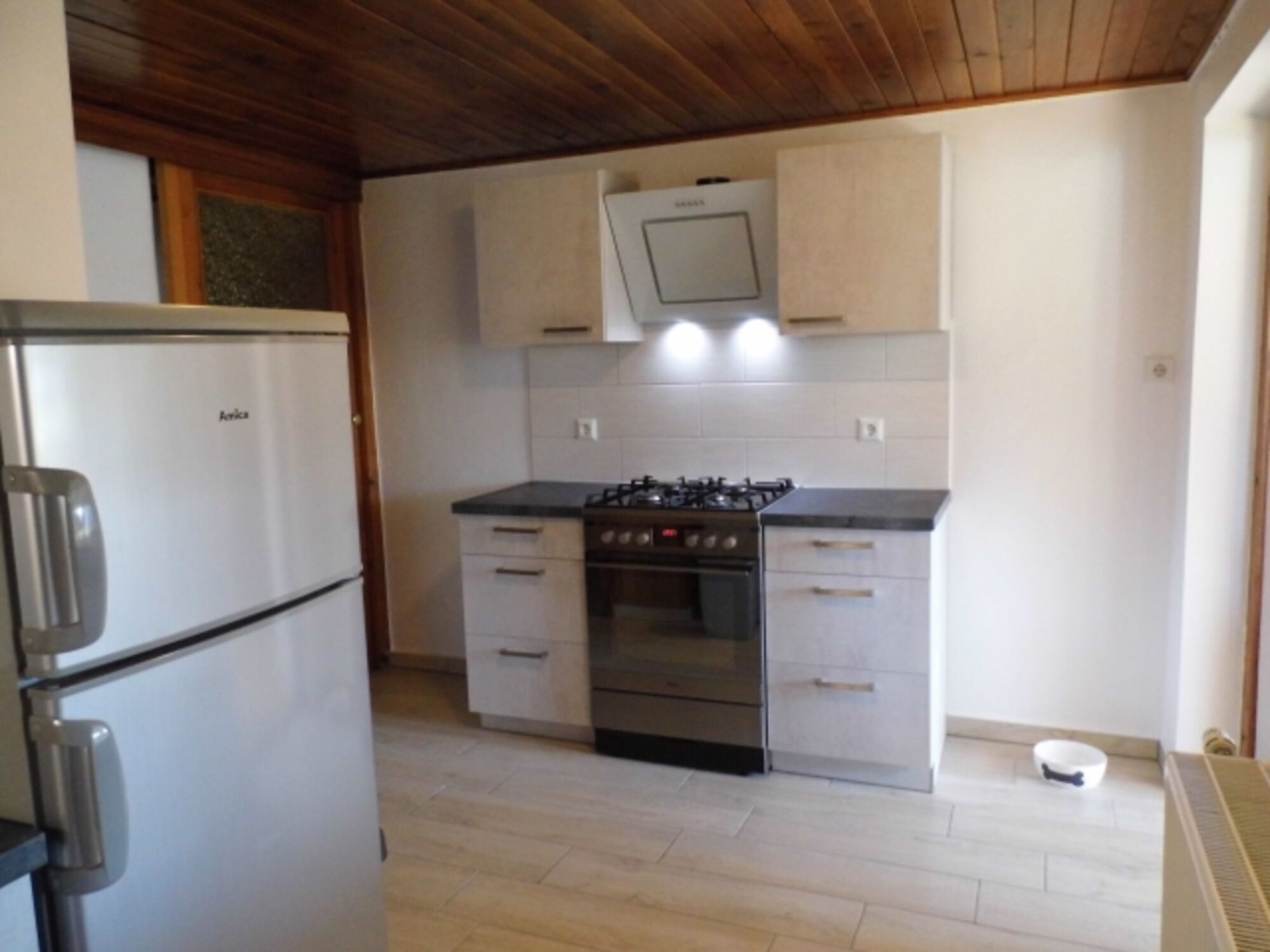 4-Platten Herd, Gasofen / Gasherd, Dunstabzugshaube, Kühlschrank mit Gefrierfach, Eierkocher, Mixer, Korkenzieher / Flaschenöffner, Gewürze (Salz, Pfeffer, Zucker), Geschirrhandtücher, Mülltüten