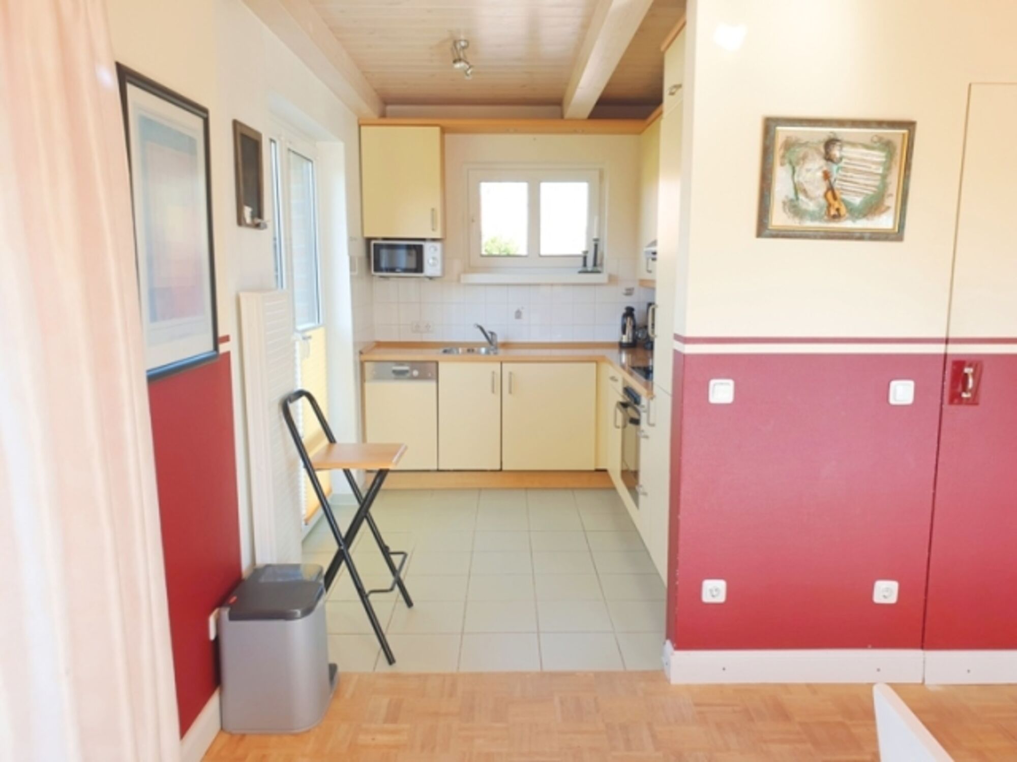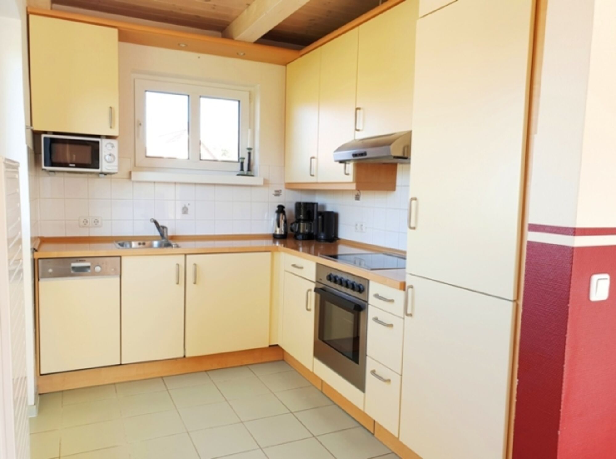 Küche: komplett eingerichtet mit Geschirr, Mikrowelle, Ceran-Kochfeld, Kaffeemaschine, Spülmaschine, Kühlschrank, Umluftbackofen, Wasserkocher, Toaster, Dunstabzugshaube und Waschmaschine