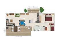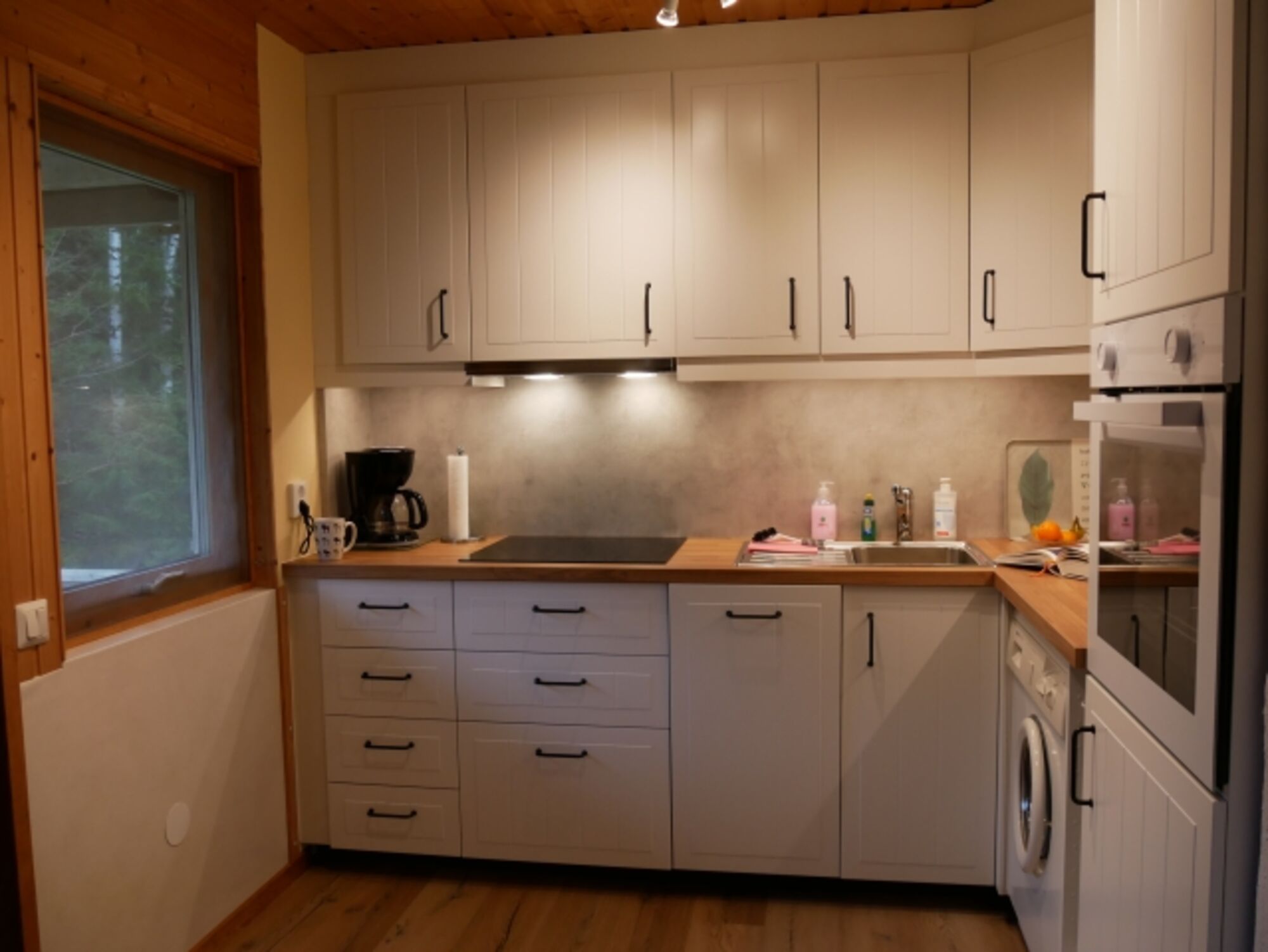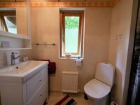 Der gemütliche Wohn-Essbereich mit der Eckcouch und den großen Fenstern bietet eine wunderschöne Aussicht über die angrenzende Wiese in Richtung des Sees Unnen. An kühlen Tagen sorgt der Specksteinofen für behagliche Gemütlichkeit. Die angrenzende moderne, offene Küche ist komplett ausgestattet. Im Haus gibt es ein Schlafzimmer mit Doppelbett und ein Zimmer mit einem Einzelbett. Das separate Gästehaus mit einem weiteren Doppelbett kann zusätzlich gemietet werden. Das Haus hat ein Tageslicht-Bad mit ebenerdiger Dusche und WC.