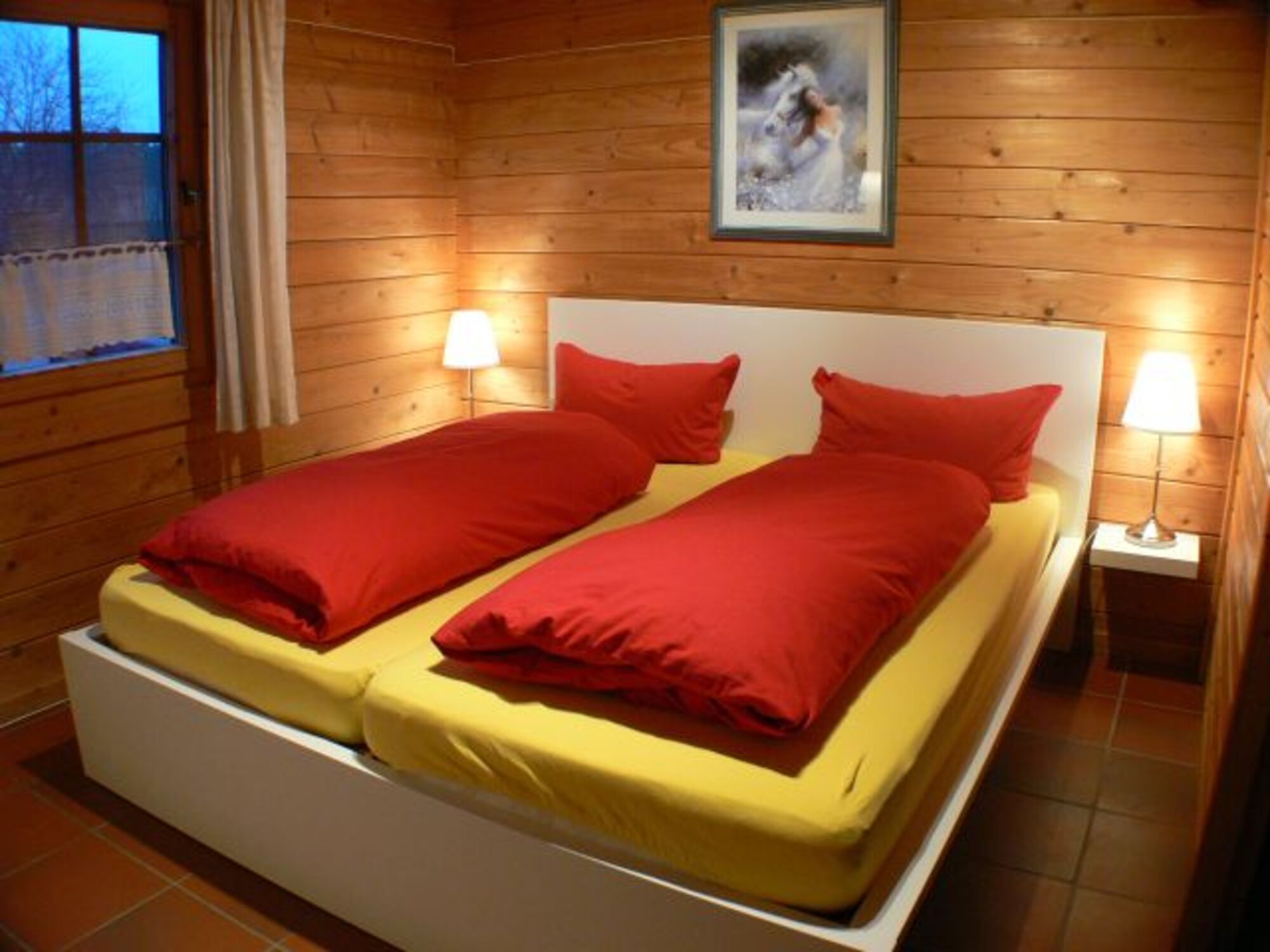 Das Hauptschlafzimmer grenzt an den Wohnbereich und ist nur durch eine Schiebewand getrennt, die sich leider nicht ganz schließen lässt, da es noch einen Holztreppe zur Galerie gibt. Doppelbett 1,80 x 2,00m, Kommode, Leselampe am Bett
